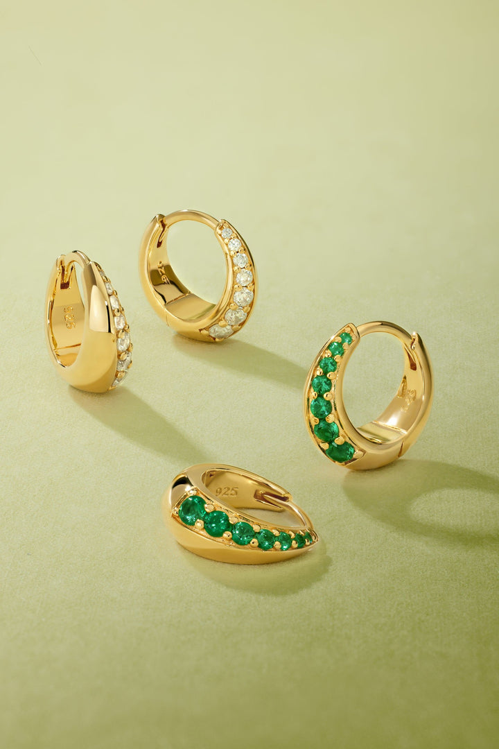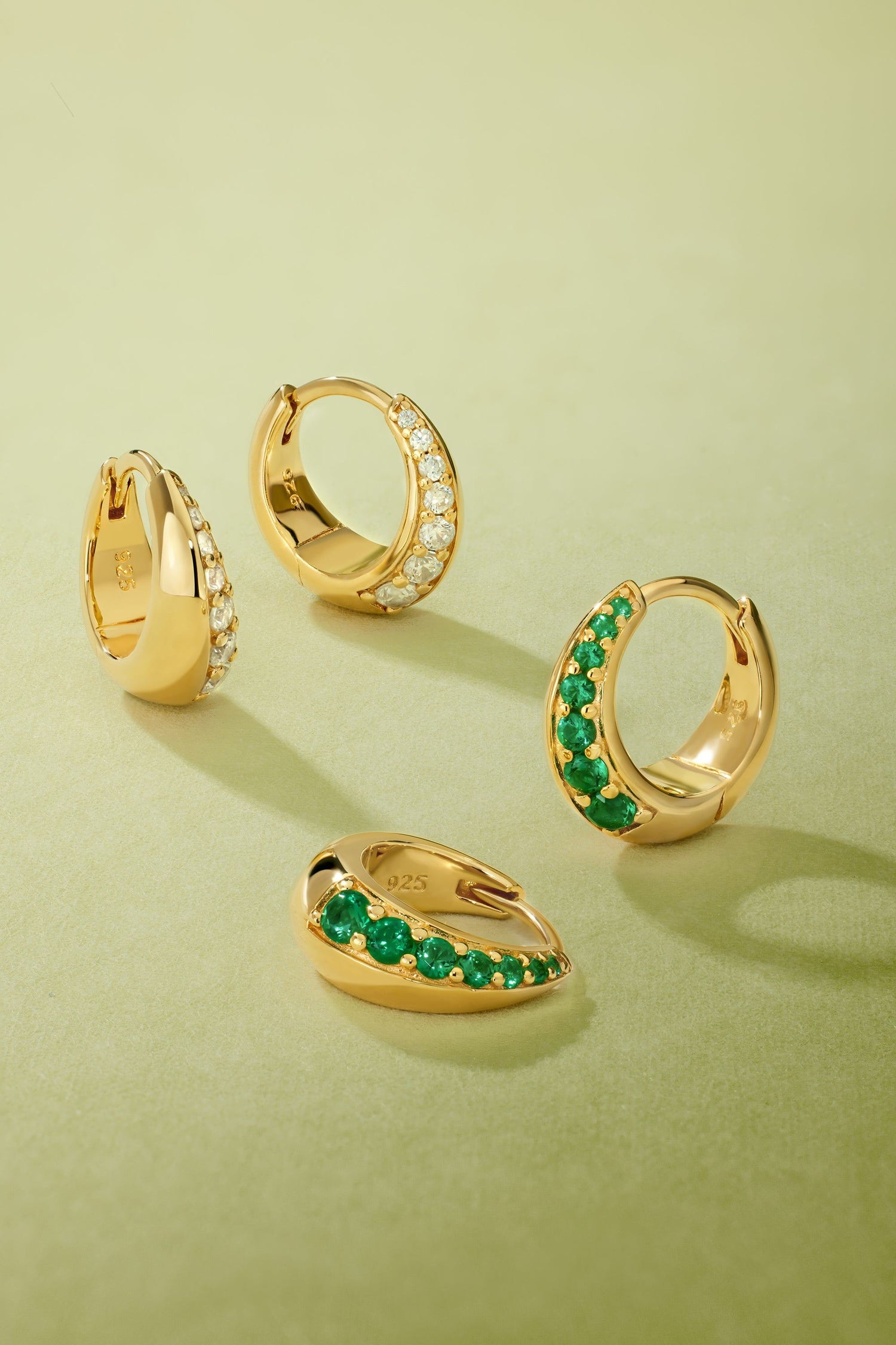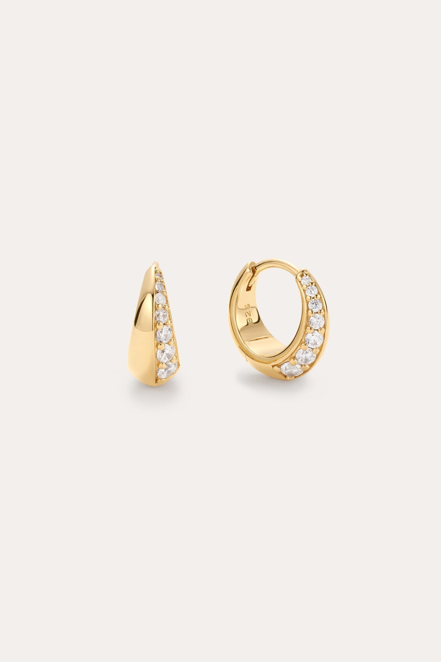 These huggie hoop earrings are crafted from 18k gold-plated sterling silver and feature 6A-grade cubic zircon. They have a knife-edge design.