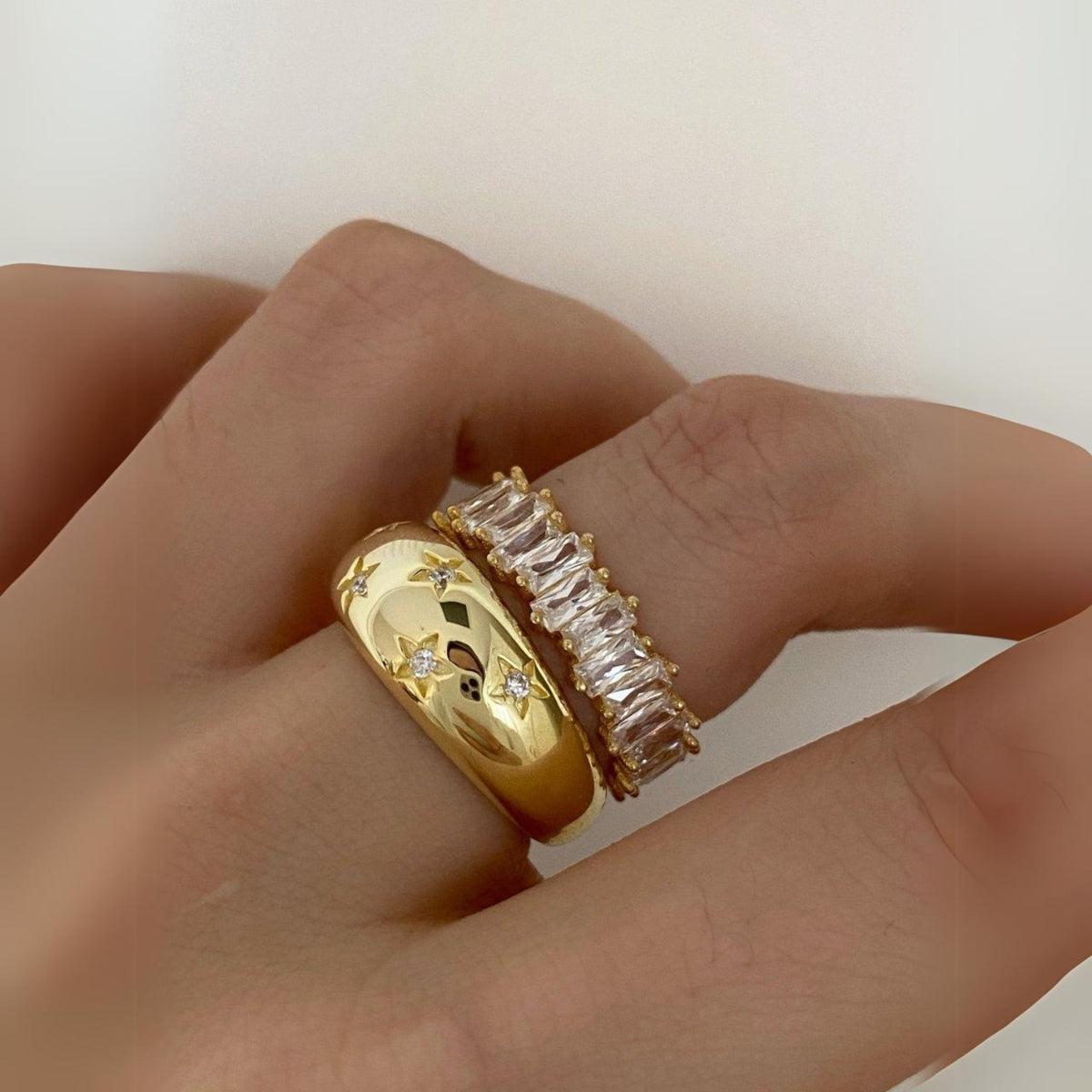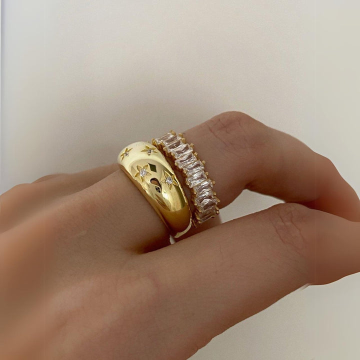 This adjustable dome ring is crafted from 925 recycled sterling silver. It is embellished with minimal star stamps and sparkling cubic zirconias. It is available in gold-tone with various stone colors.
