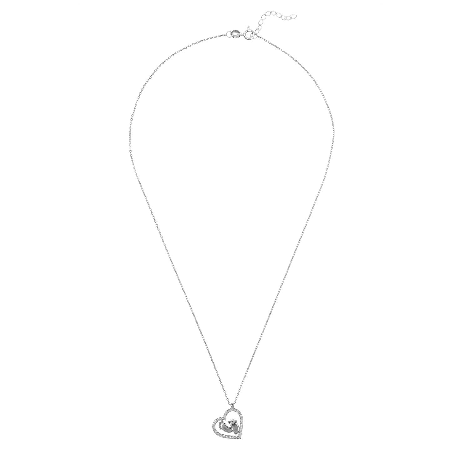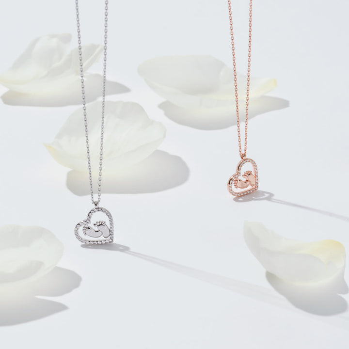 Crafted in 925 sterling silver with pavé cubic zirconia. Open heart pendant with baby feet detail. Suspended from fine sterling silver chain.