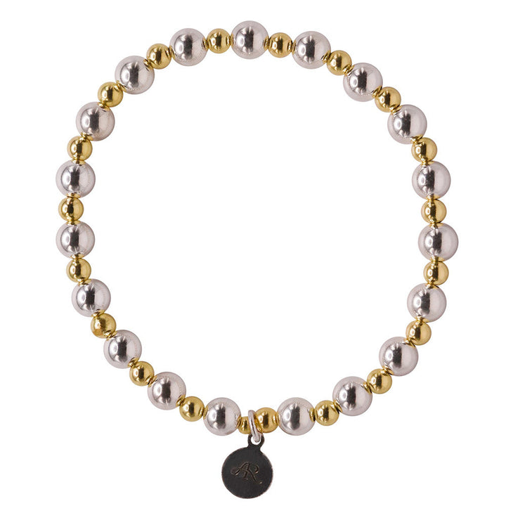 This bracelet is made with gold-filled jewelry, which is created by bonding a layer of real gold to a base metal core. It features both silver and gold components.