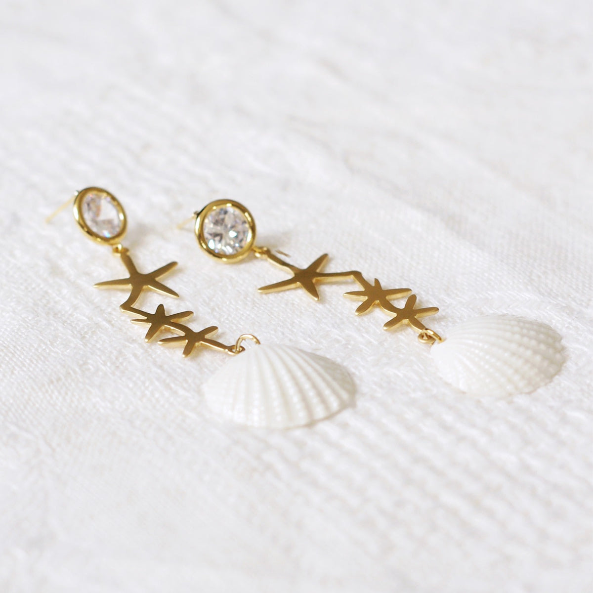These earrings feature handmade porcelain shells, gold-plated brass stars, and cubic zirconia stones. They are secured with 925 sterling silver ear posts and are handmade in Denmark.