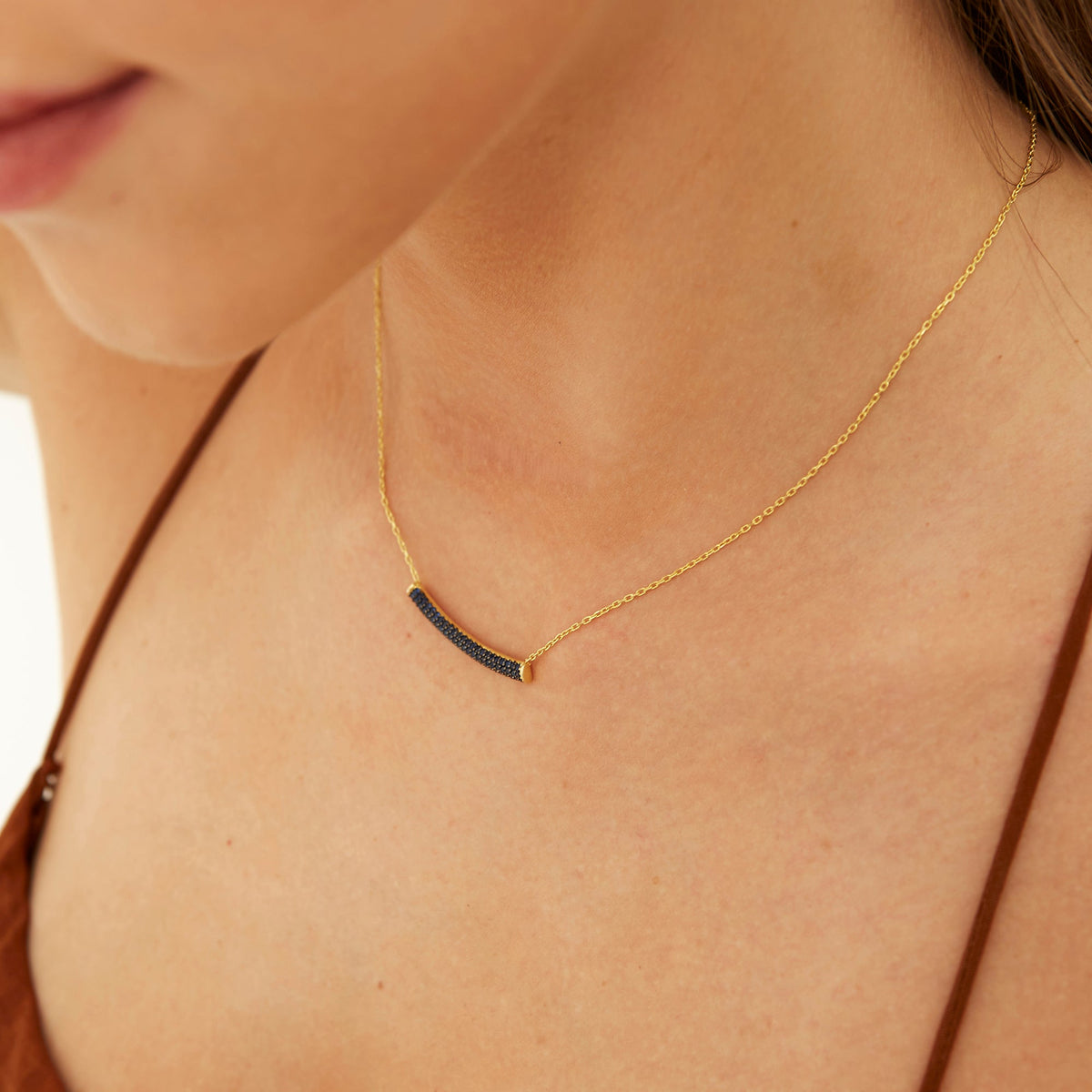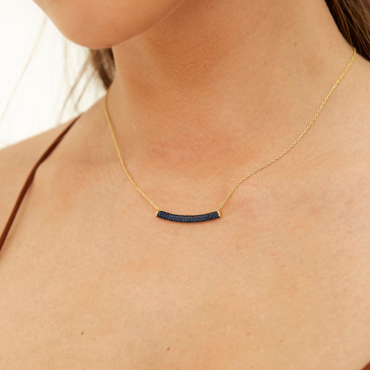 This necklace is made from 925 recycled sterling silver with a gold finish. It features a navy blue concave bar embellished with cubic zirconias and has an adjustable chain with a lobster claw lock.