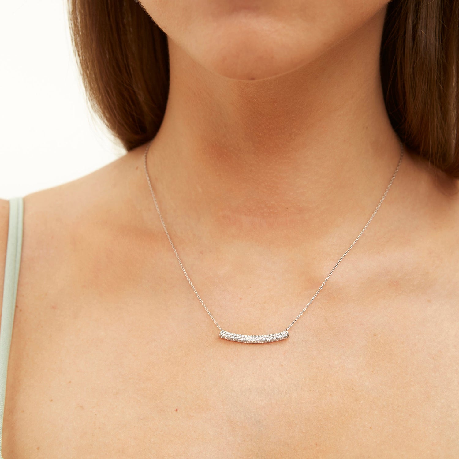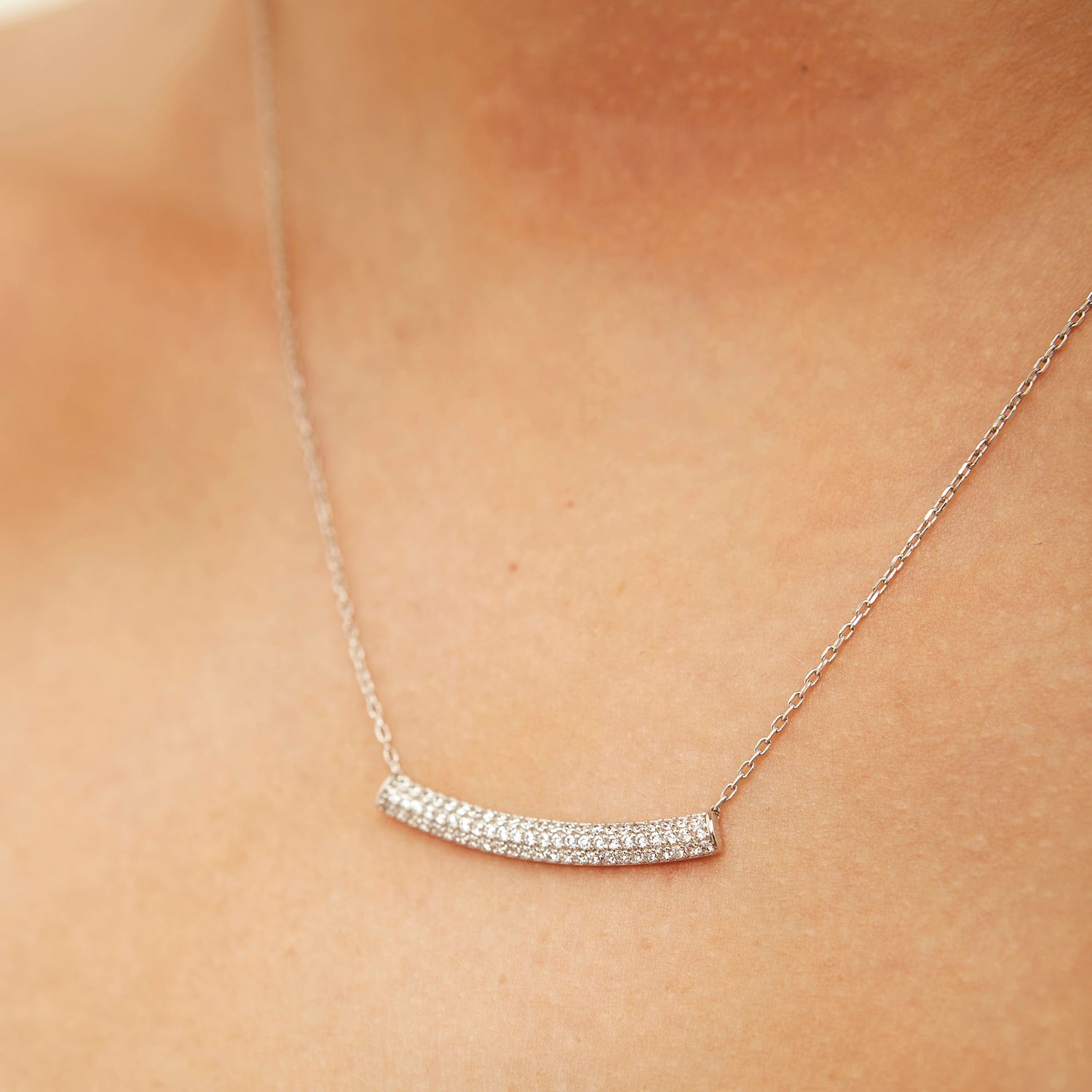 This necklace is made from 925 recycled sterling silver. It features a concave bar with shimmering cubic zirconias and an adjustable chain with a lobster claw lock.