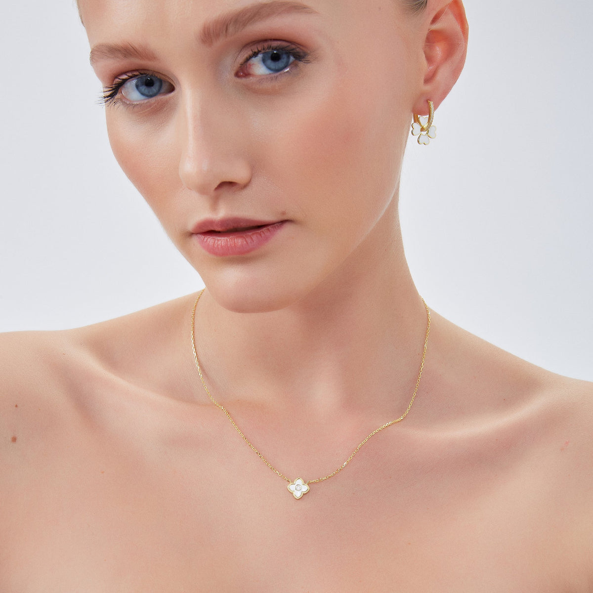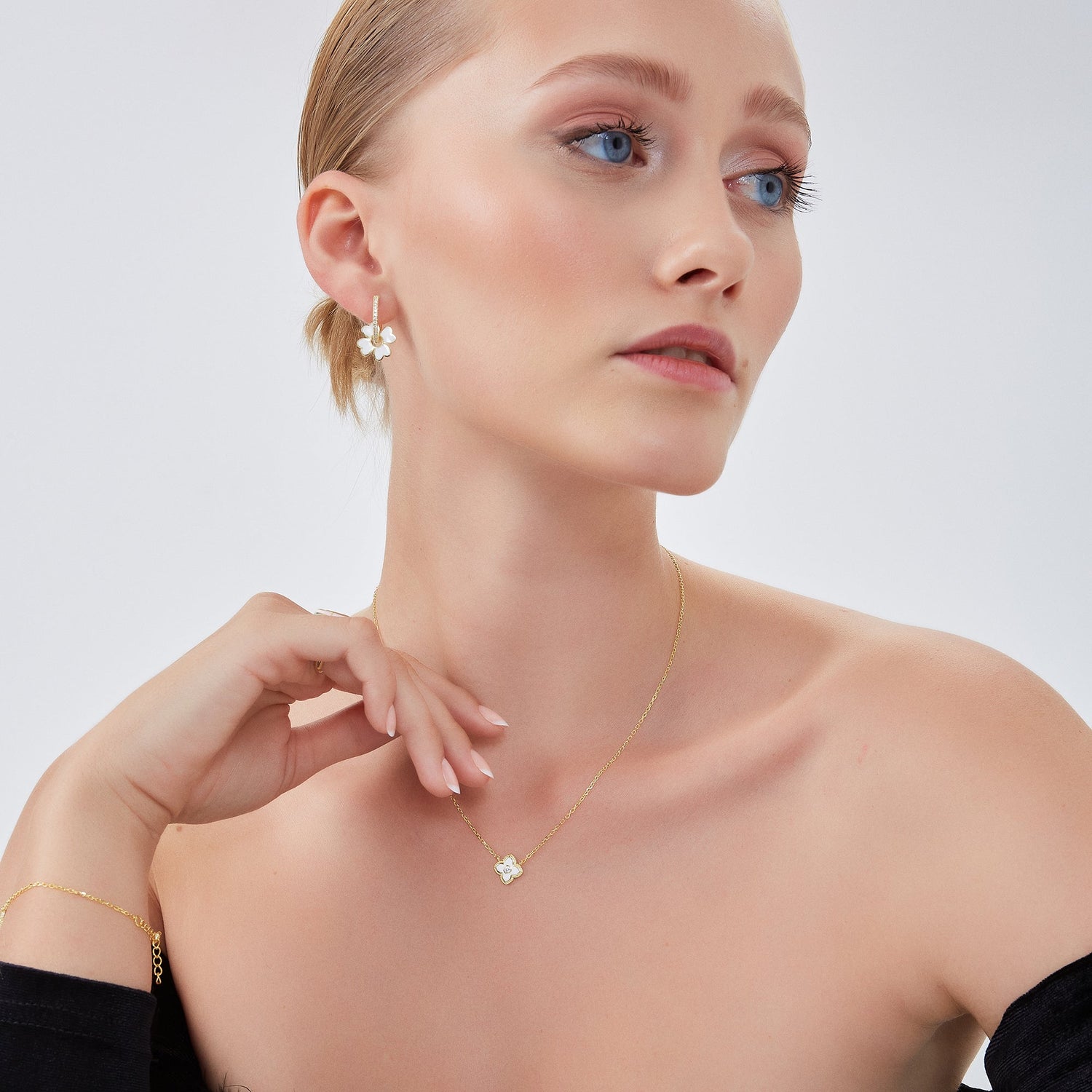 This White Enamel Four Leaf Clover Necklace With Gemstone In Sterling Silver - Gold by Spero London is a dainty and stylish accessory. The delicate four-leaf clover pendant, crafted from sterling silver with white enamel and a sparkling gemstone, is a beautiful symbol of luck and elegance. This necklace is perfect for effortlessly flaunting your fashion-forward flair.