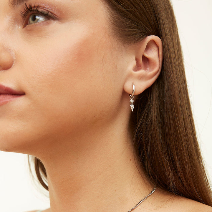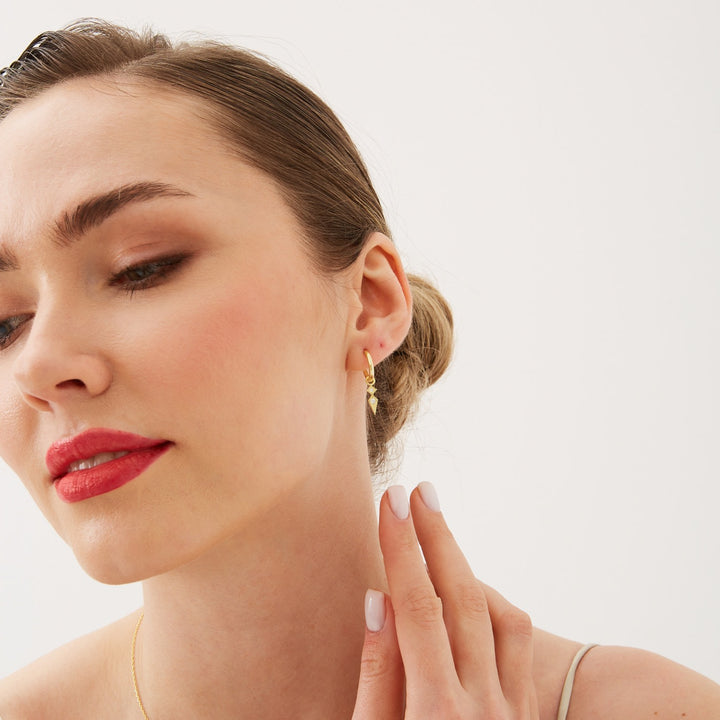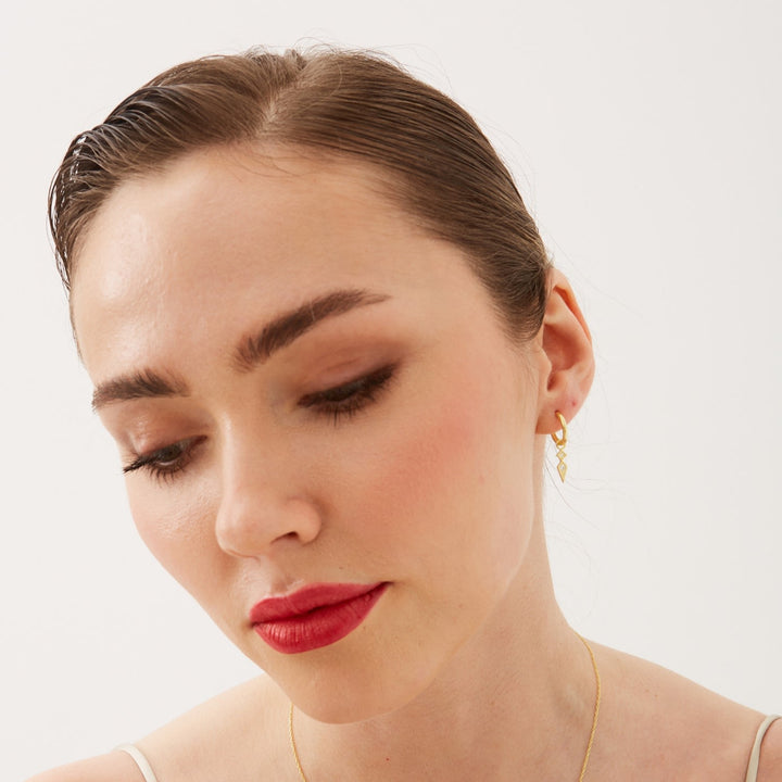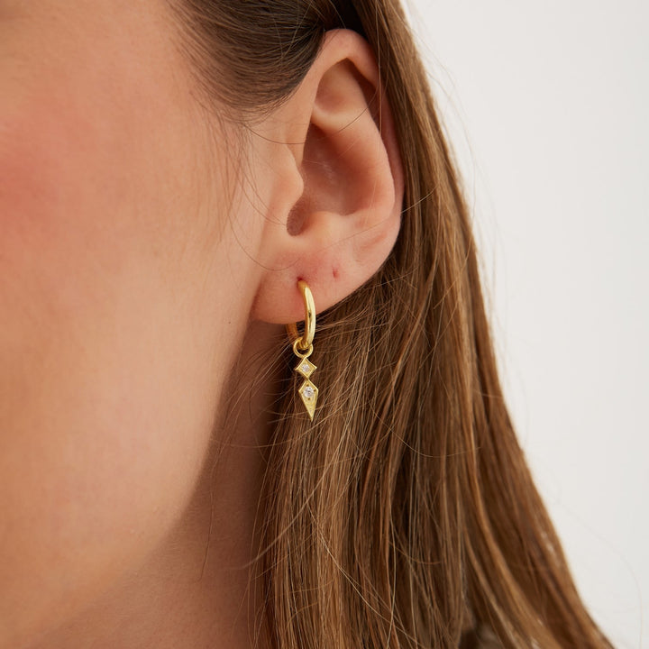 These earrings are cast in 925 sterling silver with a gold finish. They feature a rhombus shape dangling from a hoop with a hinged-back lock.