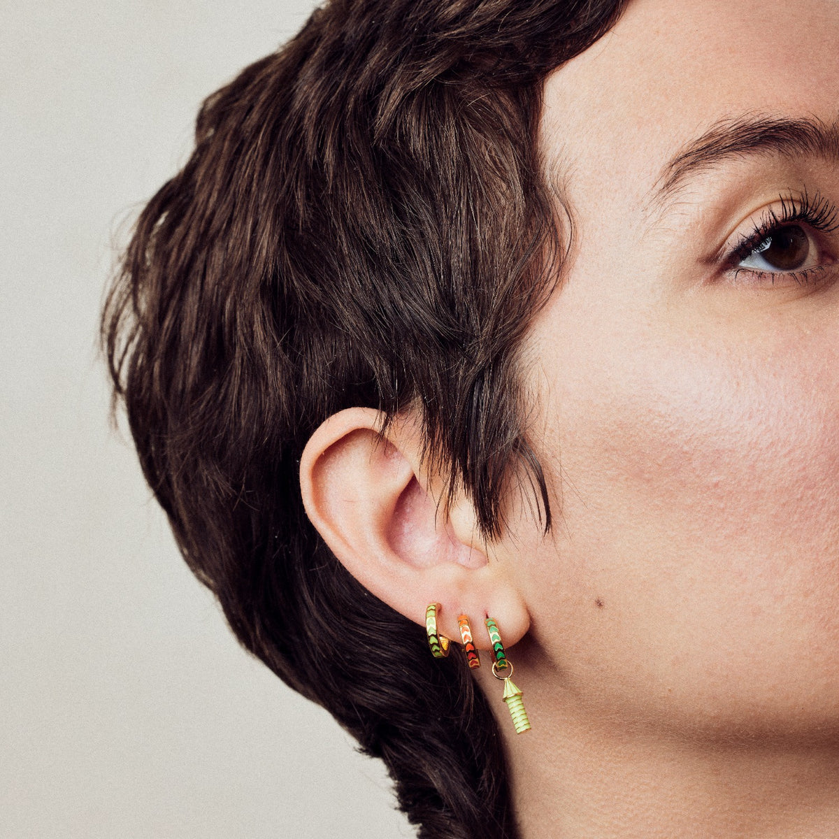 Spark Enamel Earrings Pink by Après Youth are a lovely mini hoop with a striking pop of neon pink. These earrings are a fun way to add a vibrant splash of color to any ear stack. Crafted with 2.5 microns of 22k gold electroplated onto 100% recycled sterling silver, they offer a high-quality finish with a unique modern twist. They are the perfect accessory for a playful and contemporary look.