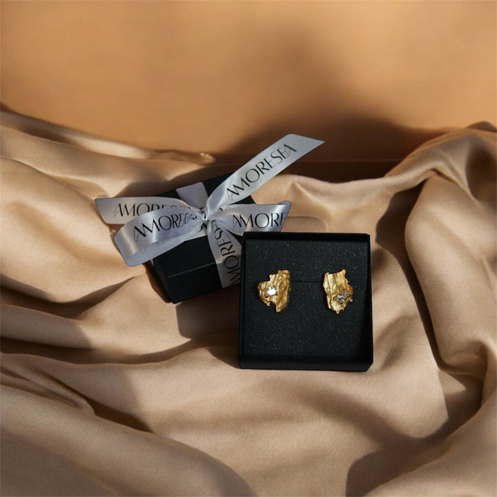 These Artistic Sterling Silver Rhinestone Ear Studs by Amoresea are a unique and luxurious accessory. Crafted with a textured shape, each piece resembles raw, sculpted gold, giving it an artisanal feel. A small marquise-cut crystal is set within each earring, adding a touch of elegance and sparkle. Made from Sterling Silver, these earrings are perfect for those who appreciate nature-inspired designs with a modern twist, making a bold statement that pairs beautifully with both casual and evening wear.