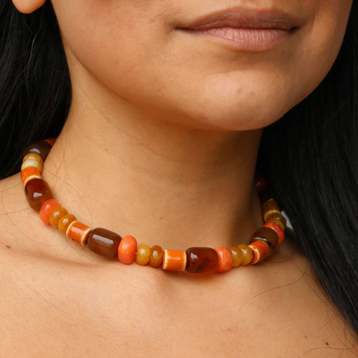 This necklace is made with hand-strung beads in caramel, clay, and ochre tones, with a gold-tone clasp. It measures 16 inches in length.