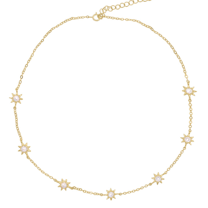 Crafted from 18k gold-plated 925 sterling silver, this choker features five 8mm x 8mm star charms and 5A cubic zirconia stones. The chain is 33cm long with a 10cm extender.