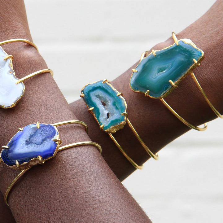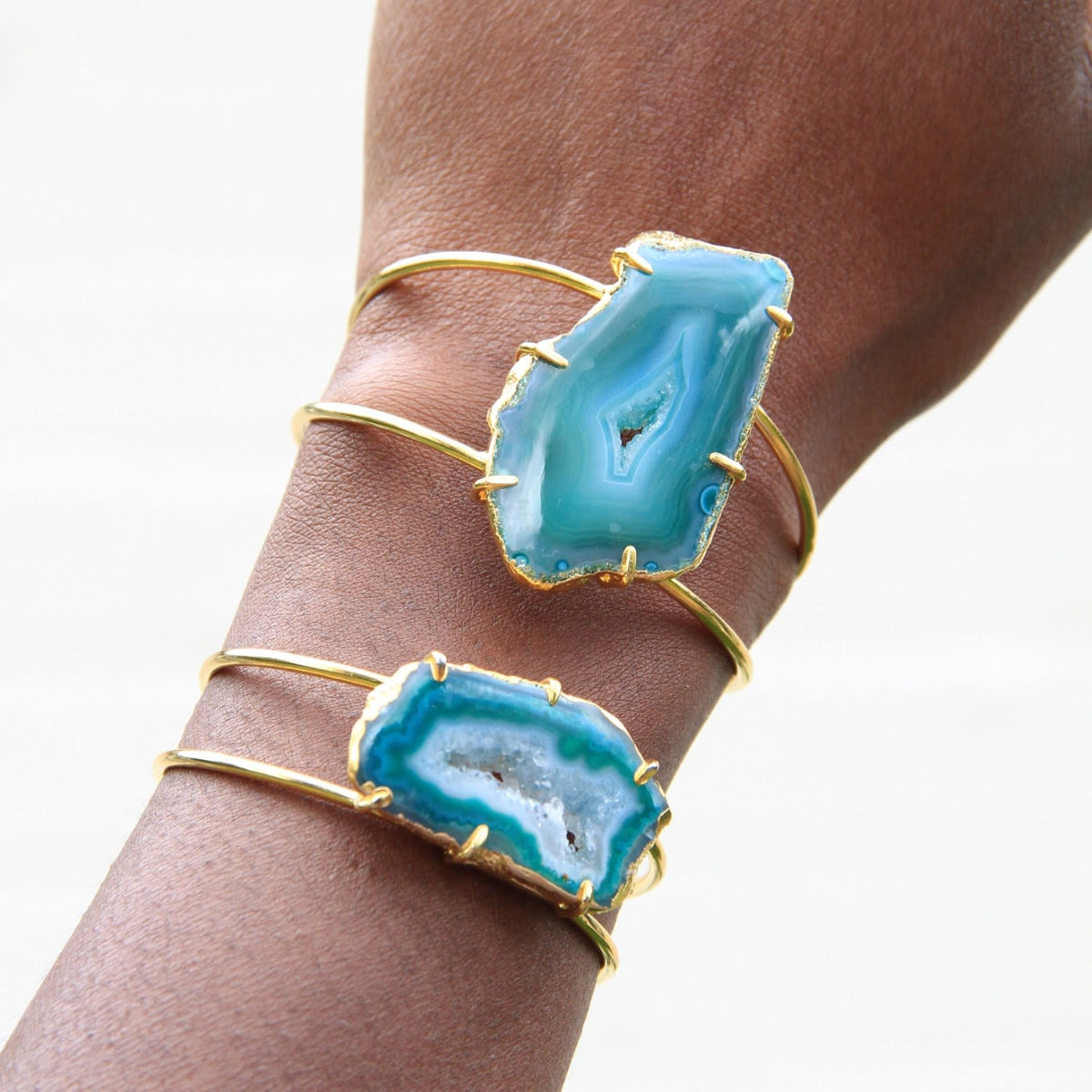 This cuff bracelet is made of agate, brass, and 18k gold plating. It features a unique glossy green agate semi-precious stone with crystal linings.