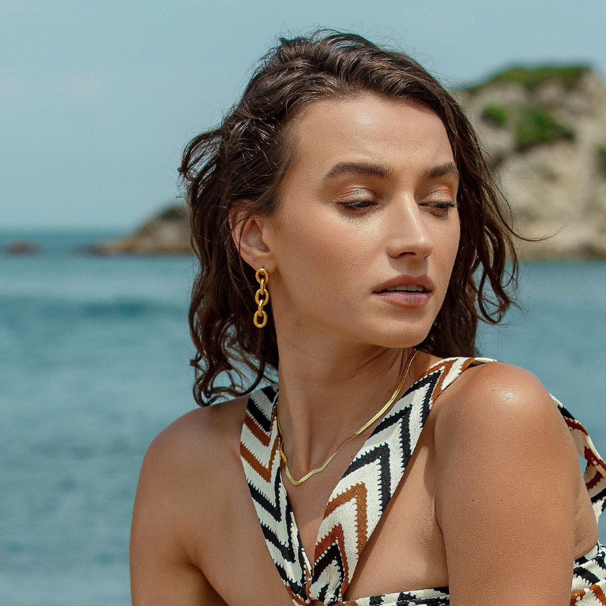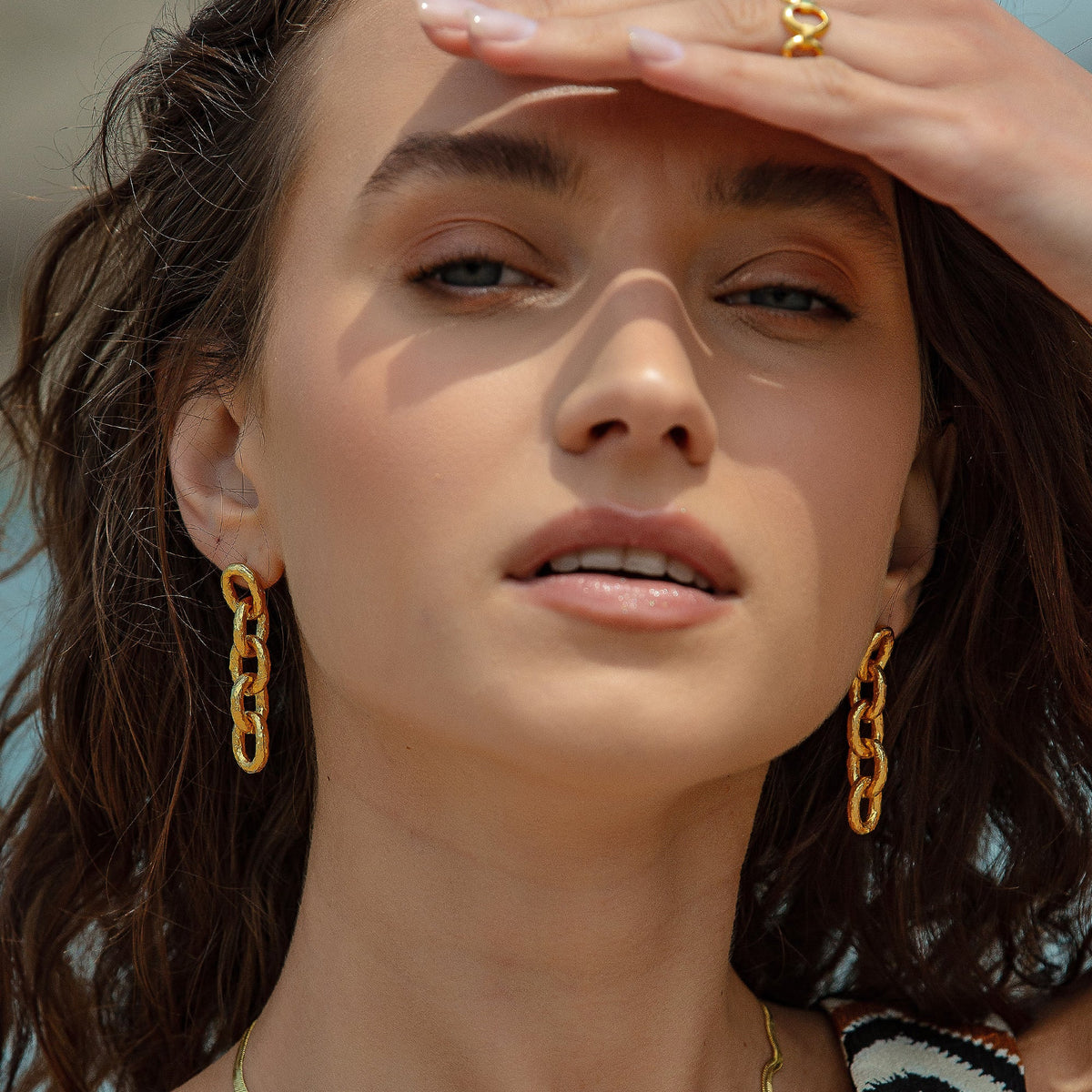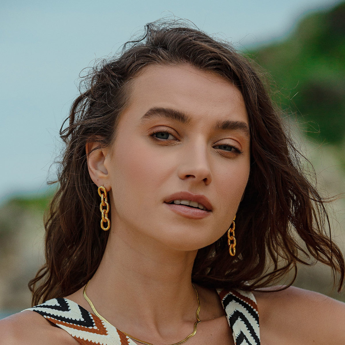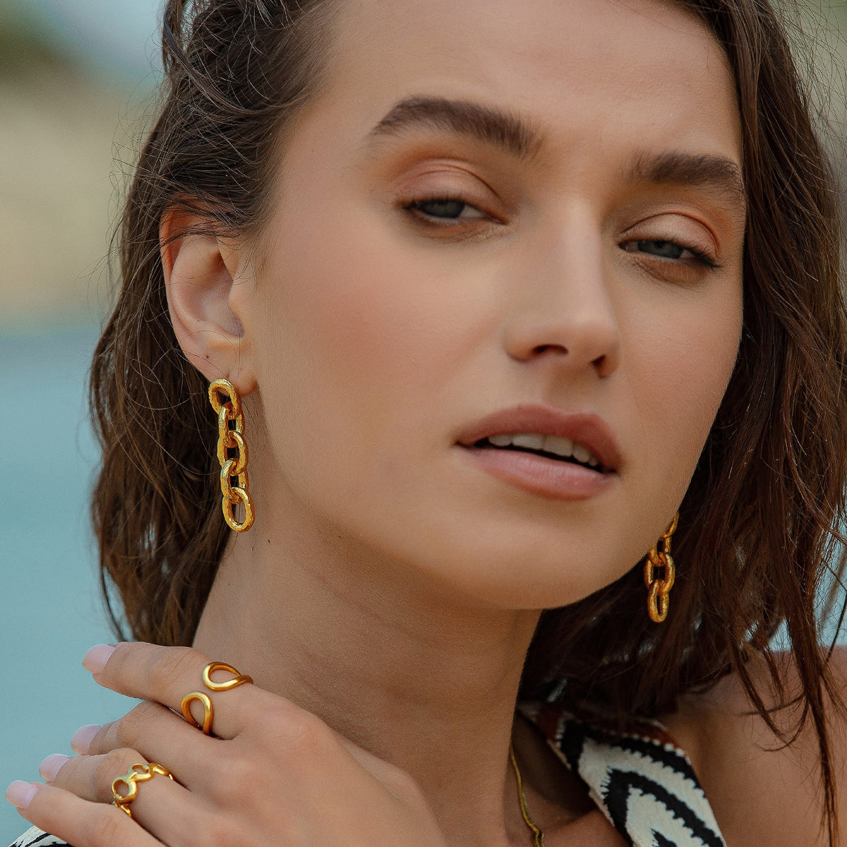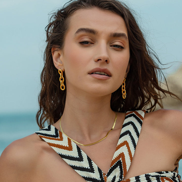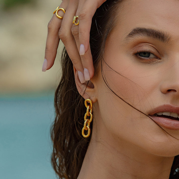 These Golden Hammered Link Chain Drop Earrings by Mejoma are a luxurious and sophisticated accessory. The handmade link chain features a stunning hammered texture, which adds a touch of artistic flair and creates a mesmerizing look. These earrings are perfect for elevating your style and making a statement.