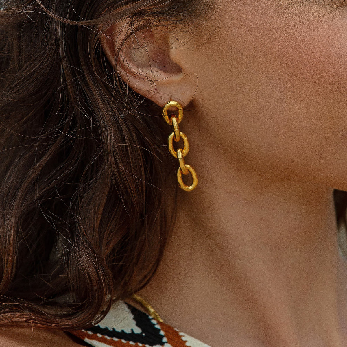 These earrings are a golden hammered link chain drop earring style.