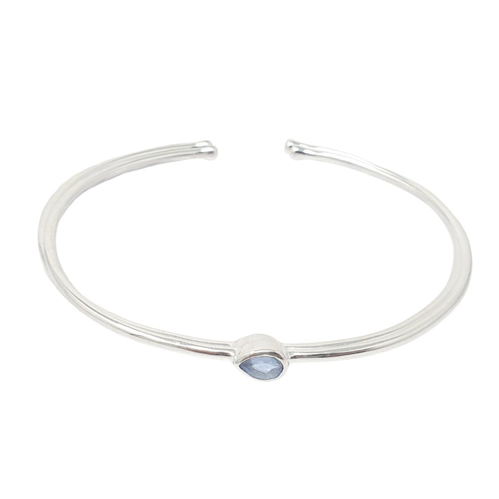 This bangle bracelet is made of sterling silver and features a blue topaz gemstone.