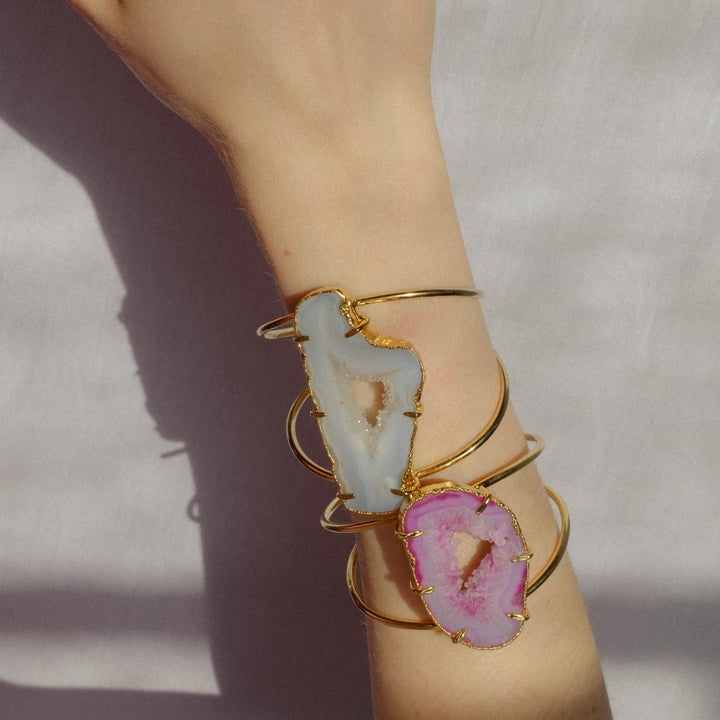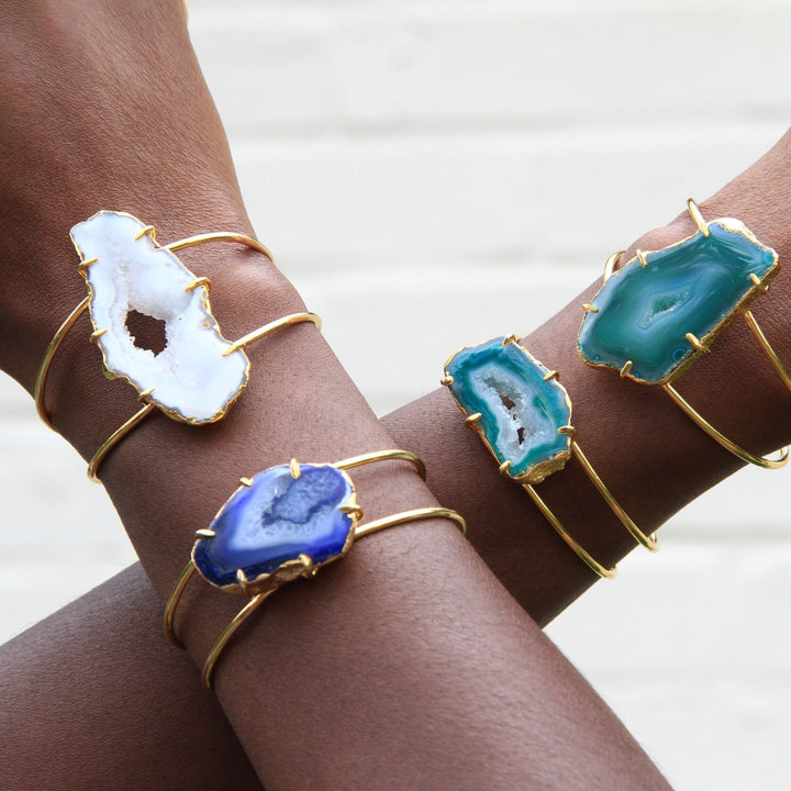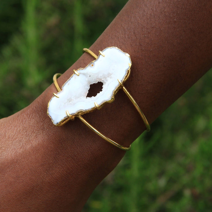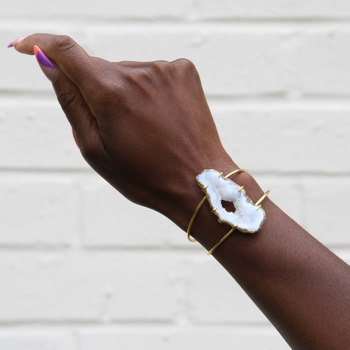 Natural white agate gemstone. Brass base with 18k gold plating. Crystal-lined accents. Adjustable cuff design.