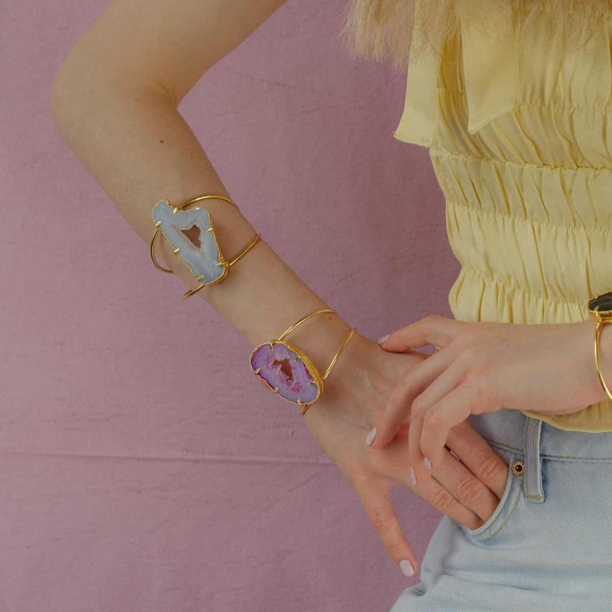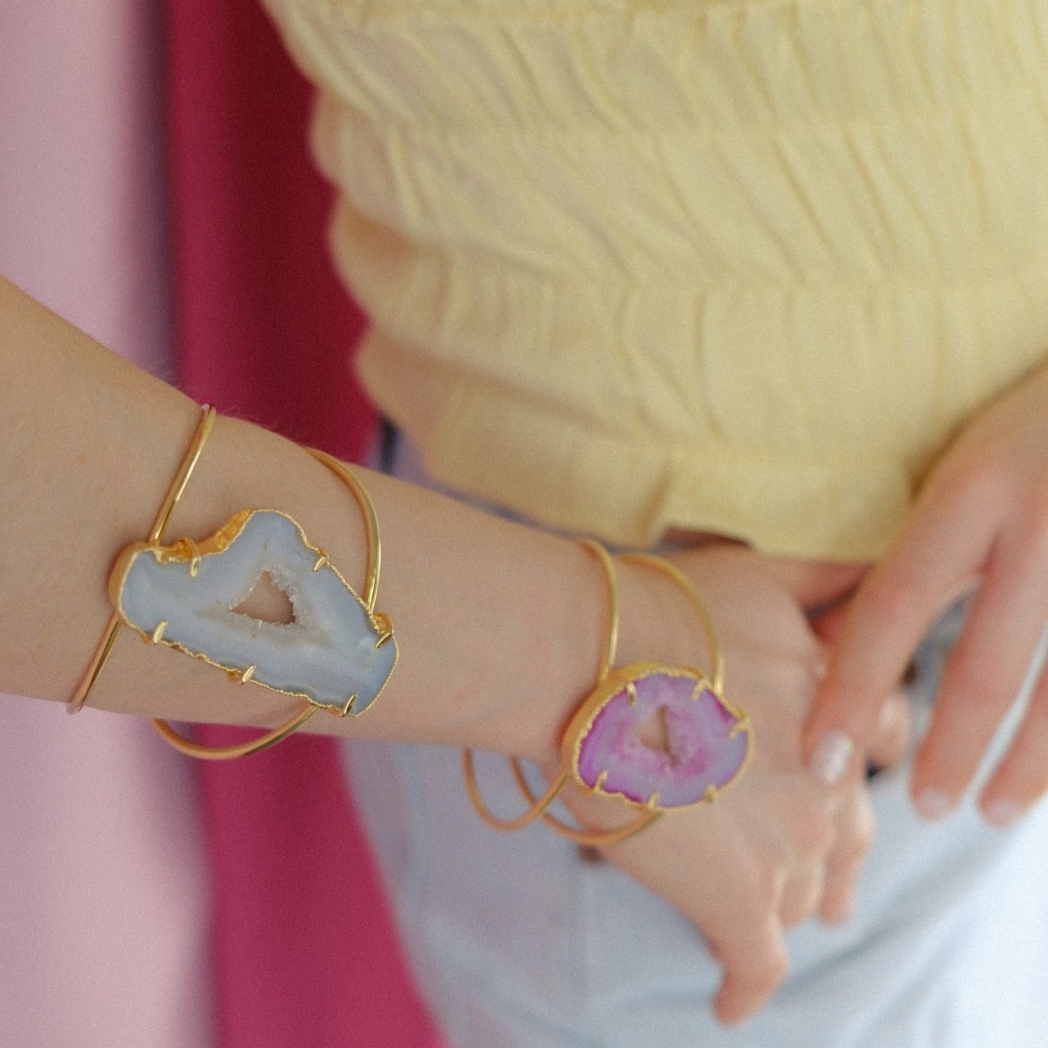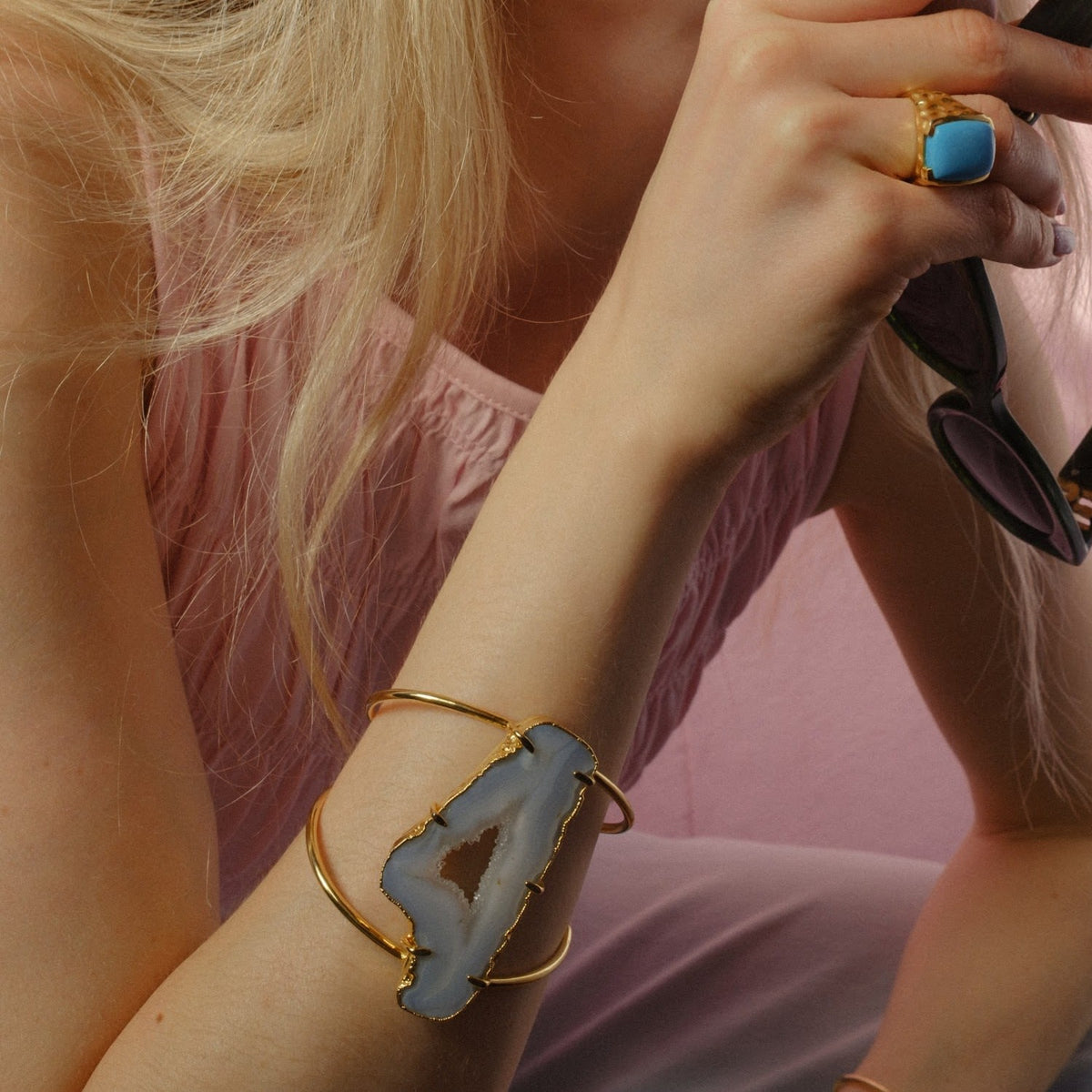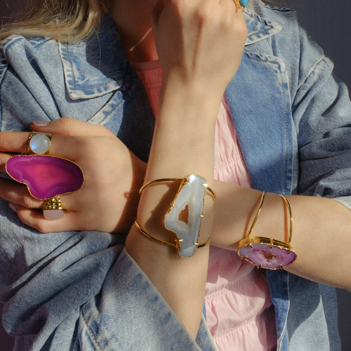 This Natural White Gemstone Summer Love Cuff Bracelet by Yaa Yaa London brings modern glamour infused with natural beauty. Featuring glossy agate in shades of white and grey, accented with crystal details, it’s a confident statement of individuality. No two cuffs are alike, making each bracelet as unique as its wearer.