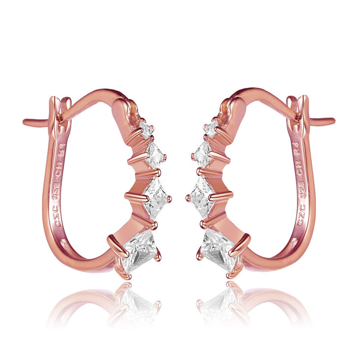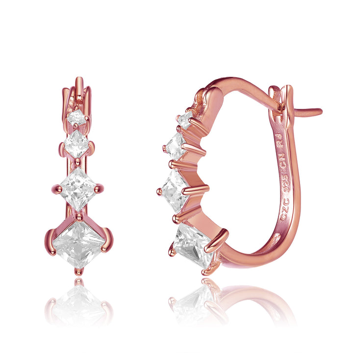 These hoop earrings are crafted from 92.5% sterling silver with rose plating. They feature square-cut white cubic zirconia stones and have clip-in clasps.