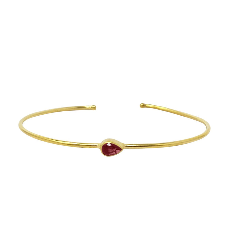 This bangle is made from gold-plated materials and features a garnet gemstone.