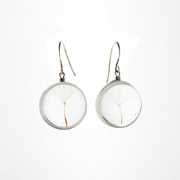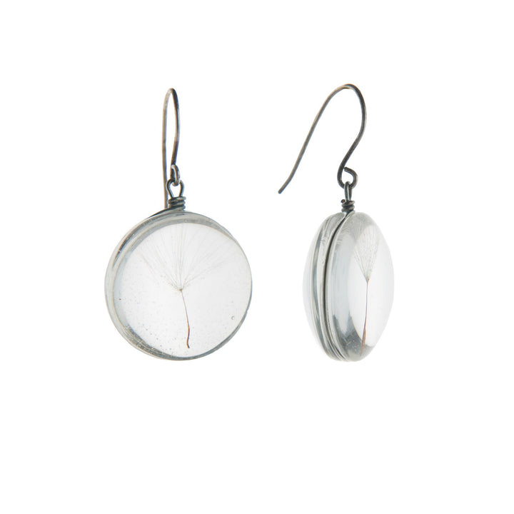 Handcrafted glass spheres filled with dried dandelion fluff, finished with sterling silver fittings.