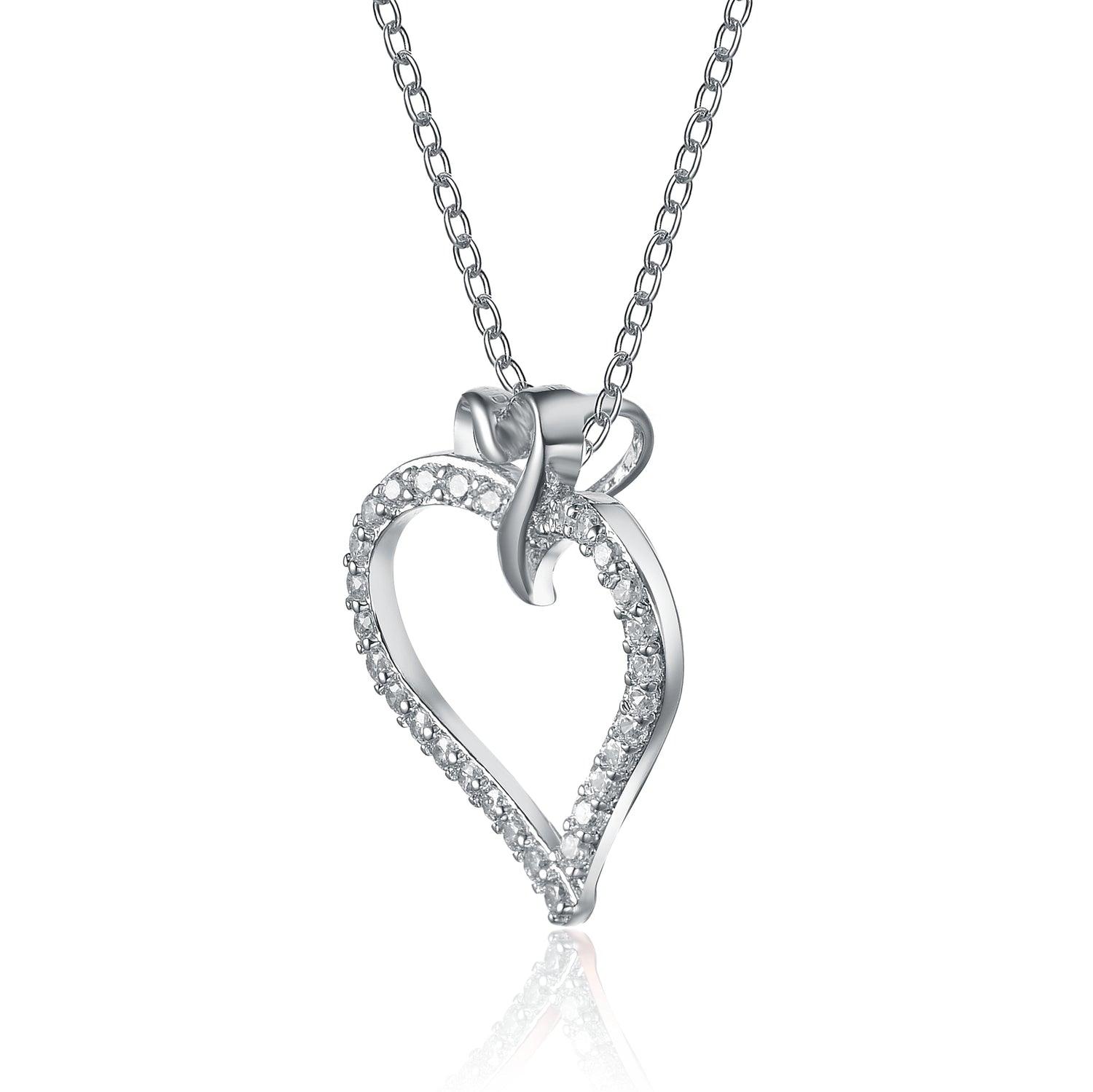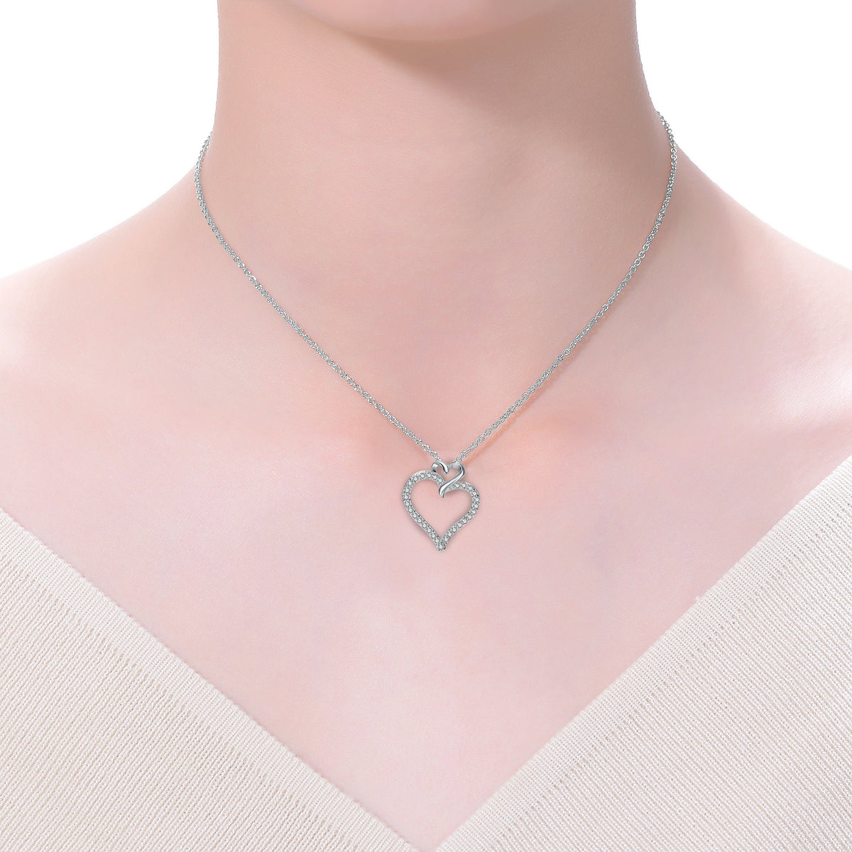 This necklace features a double heart pendant crafted from .925 sterling silver with white gold plating. It is decorated with clear cubic zirconia stones and secured with a spring ring clasp.