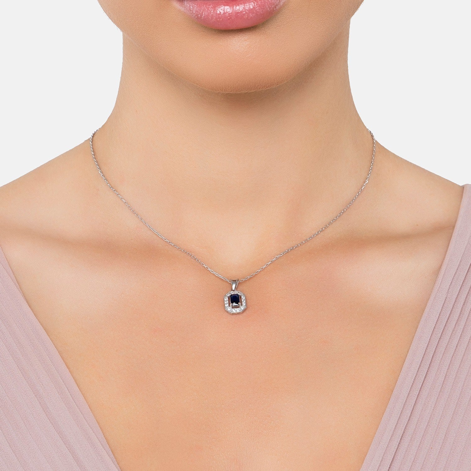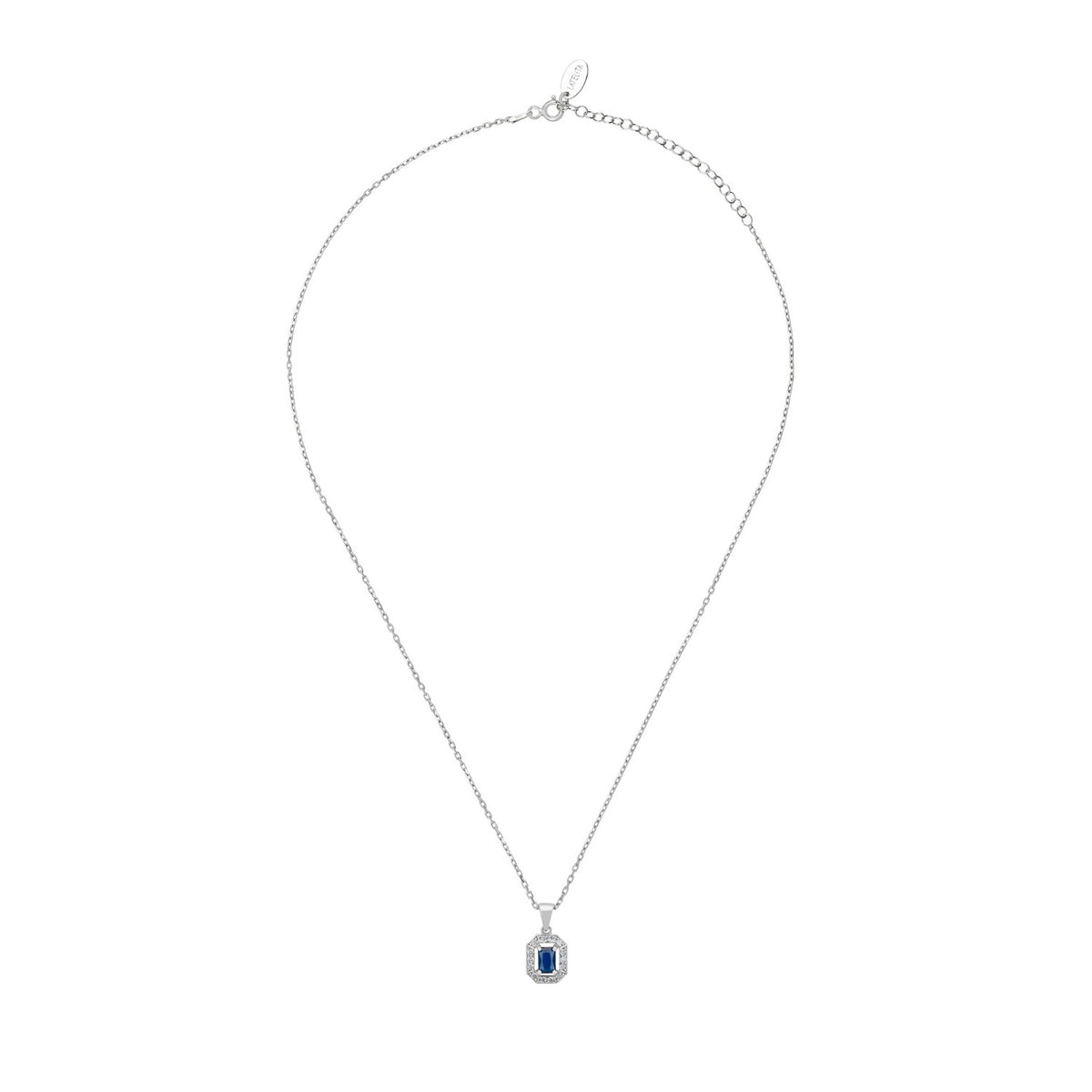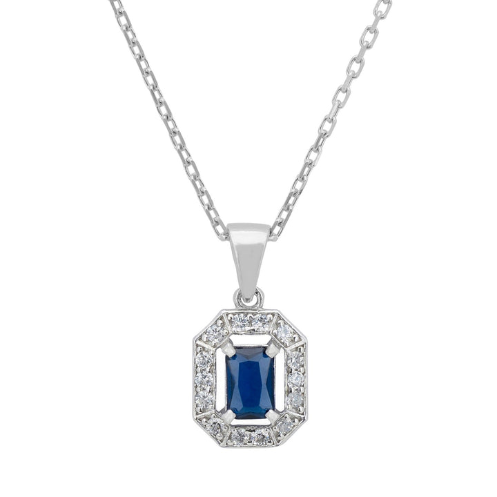 This necklace is handcrafted in 925 Sterling Silver dipped in Rhodium. It features a lab-grown Sapphire Gemstone and a halo of cubic zirconia.