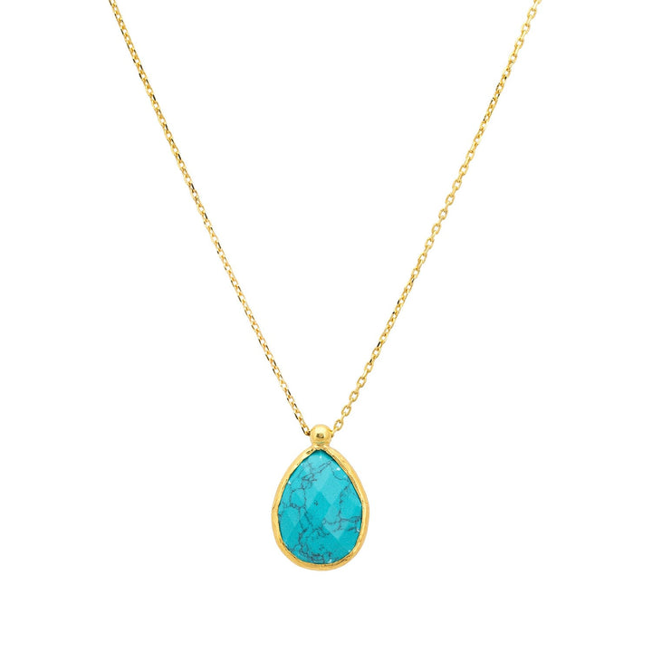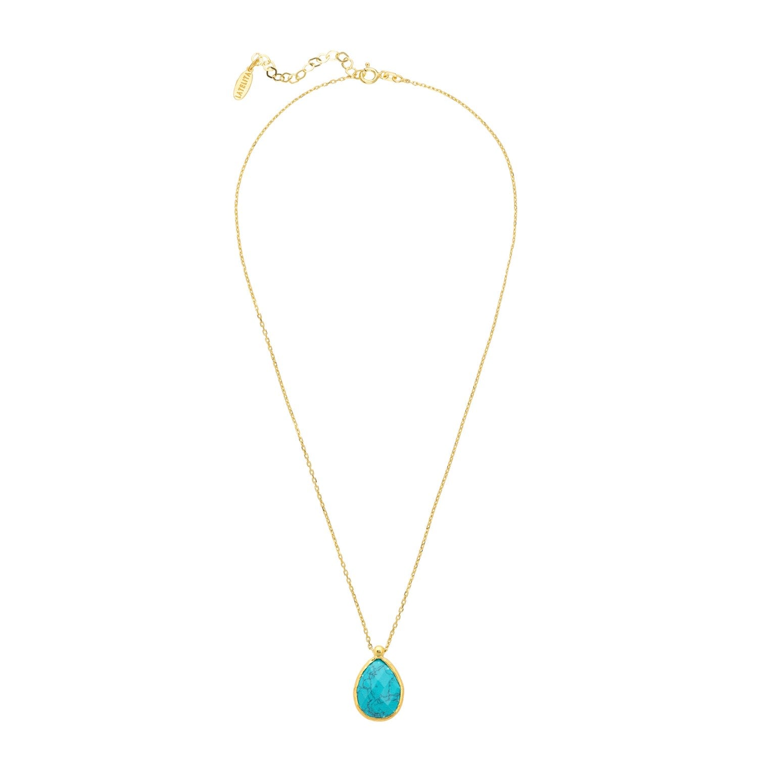 This Petite Drop Necklace Gold Arizona Turquoise by Latelita is a vibrant and symbolic accessory. It features a medium-sized teardrop-shaped Arizona Turquoise gemstone beautifully set within a metallic setting. The necklace is made from 925 sterling silver and dipped in 18ct gold. Turquoise represents wisdom, tranquility, and protection.