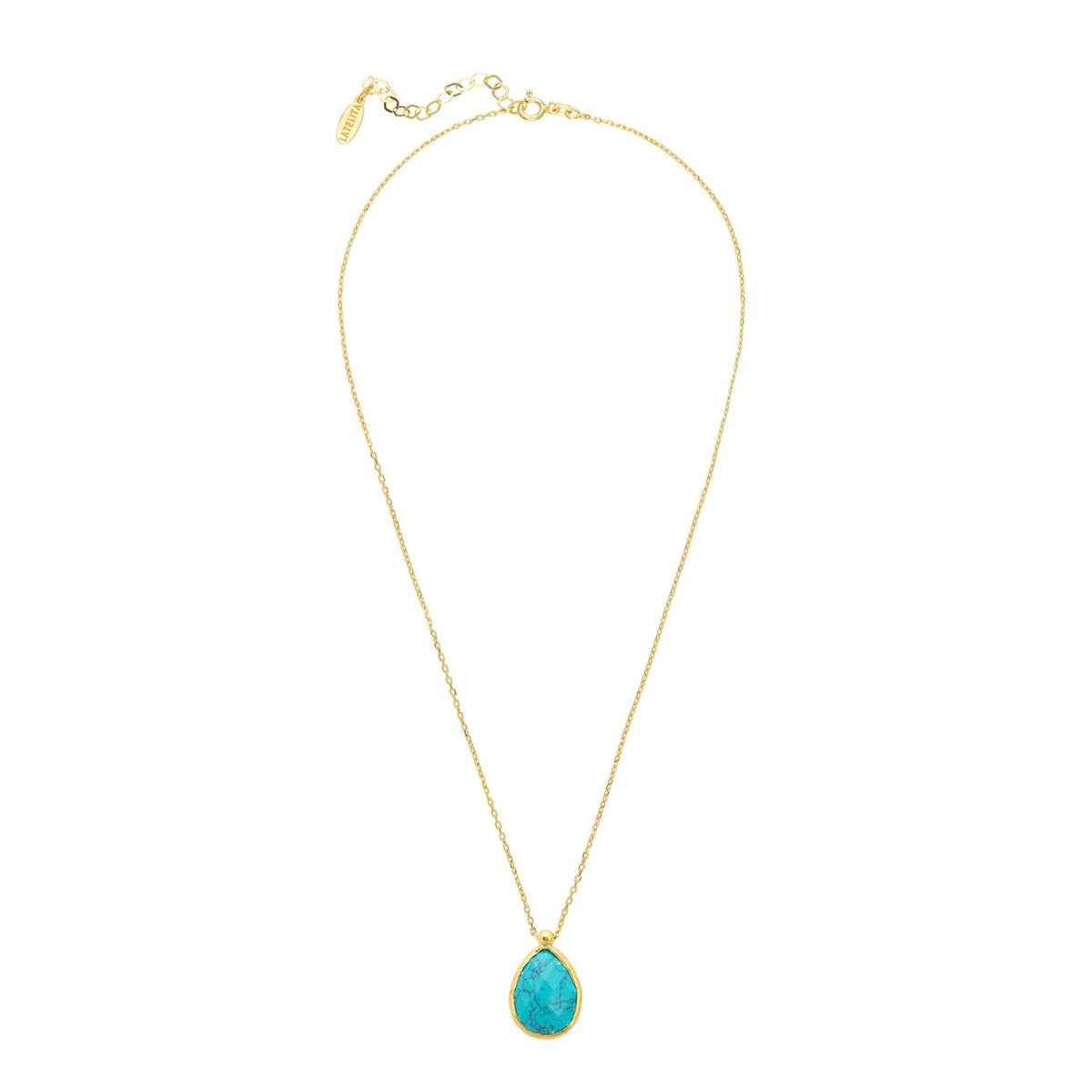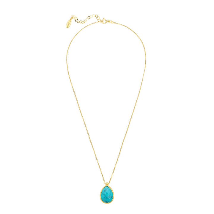 This necklace is made from 925 sterling silver and is dipped in 18ct gold. It features a teardrop-shaped Arizona Turquoise gemstone. The stone size is 1.7cm x 1.4cm.