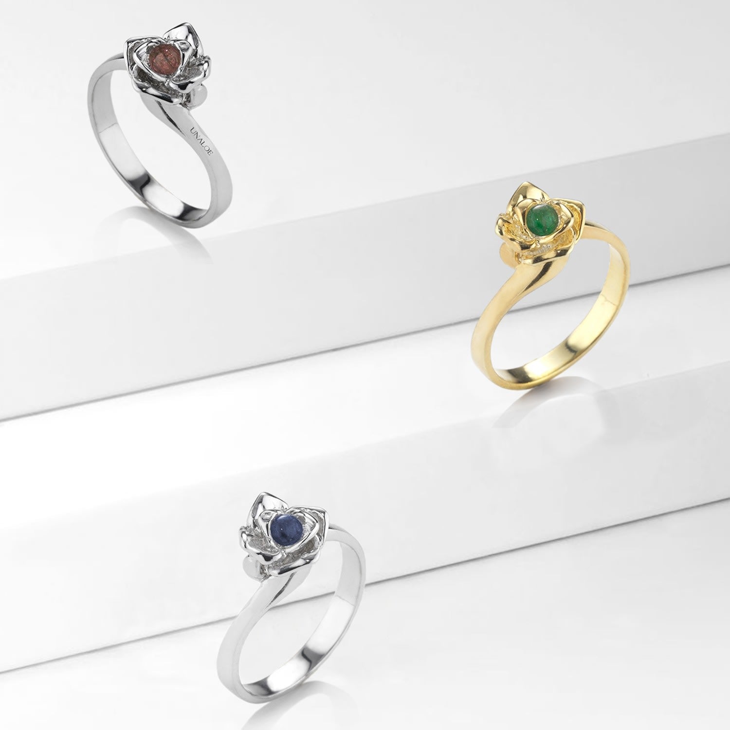 This Magnifica Silver Ring in Gold-Plated Emerald by Unaloe captures the essence of rebirth and renewal through its rose-inspired form. Crafted entirely by hand and plated in luminous 18k gold, the ring blends artisanal antiquing with rich sophistication. At its center, the emerald cabochon glows with verdant depth, long associated with Venus, eloquence, and the renewal of nature’s cycles. Its refined floral design radiates elegance, making it a powerful token of love, beauty, and wisdom. As both an everyday jewel and a treasured keepsake, it embodies Unaloe’s devotion to Italian craftsmanship and meaningful design.