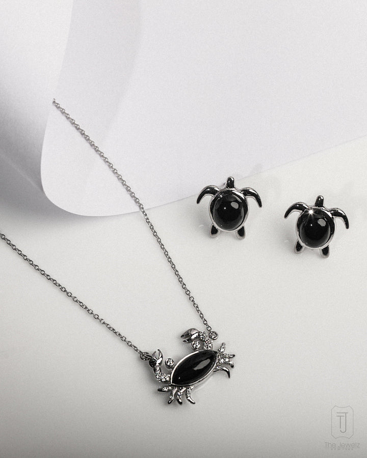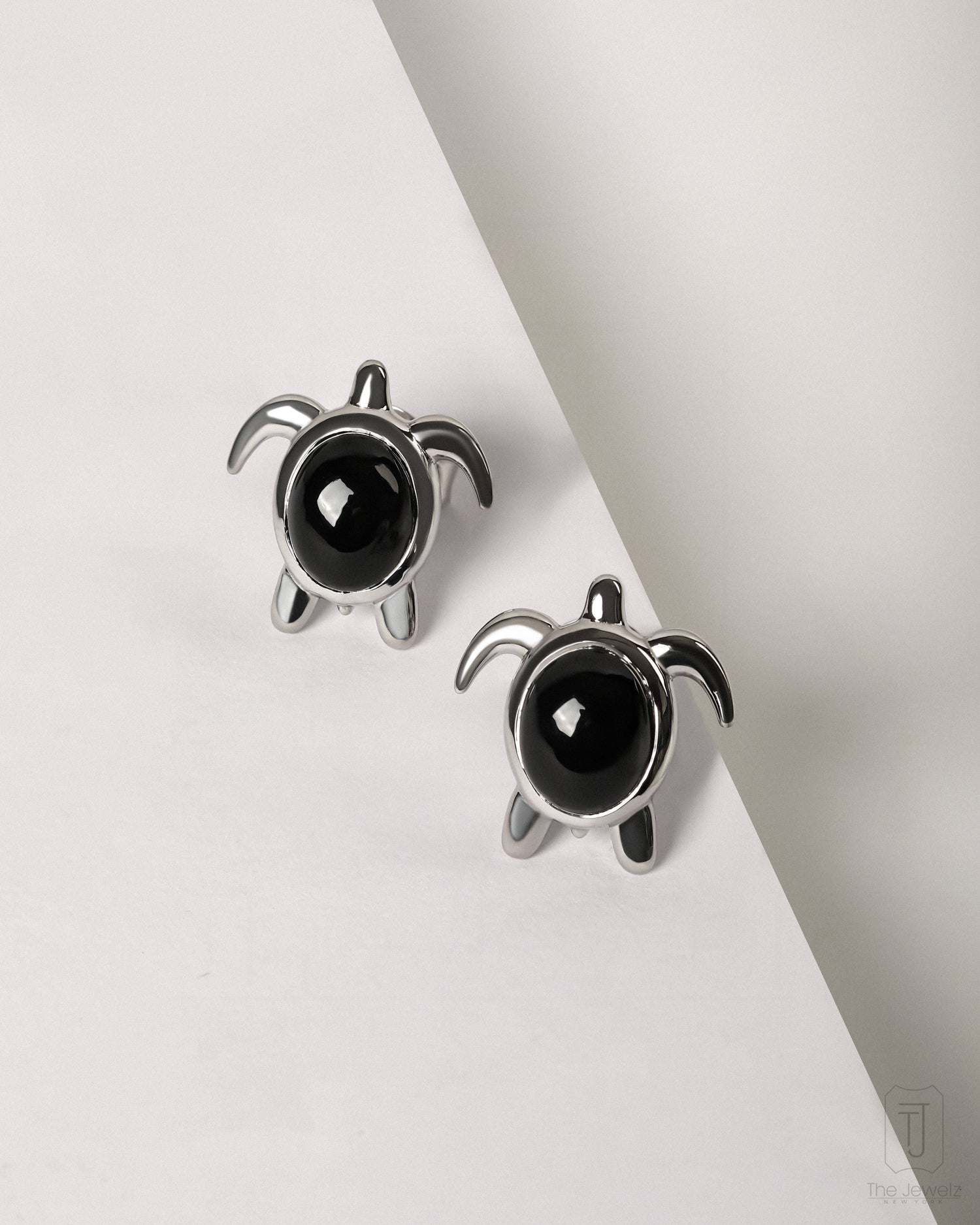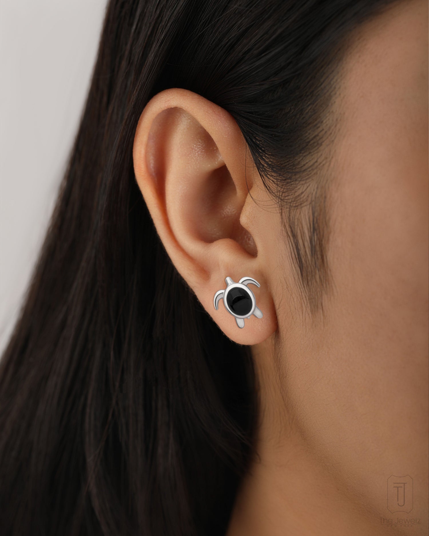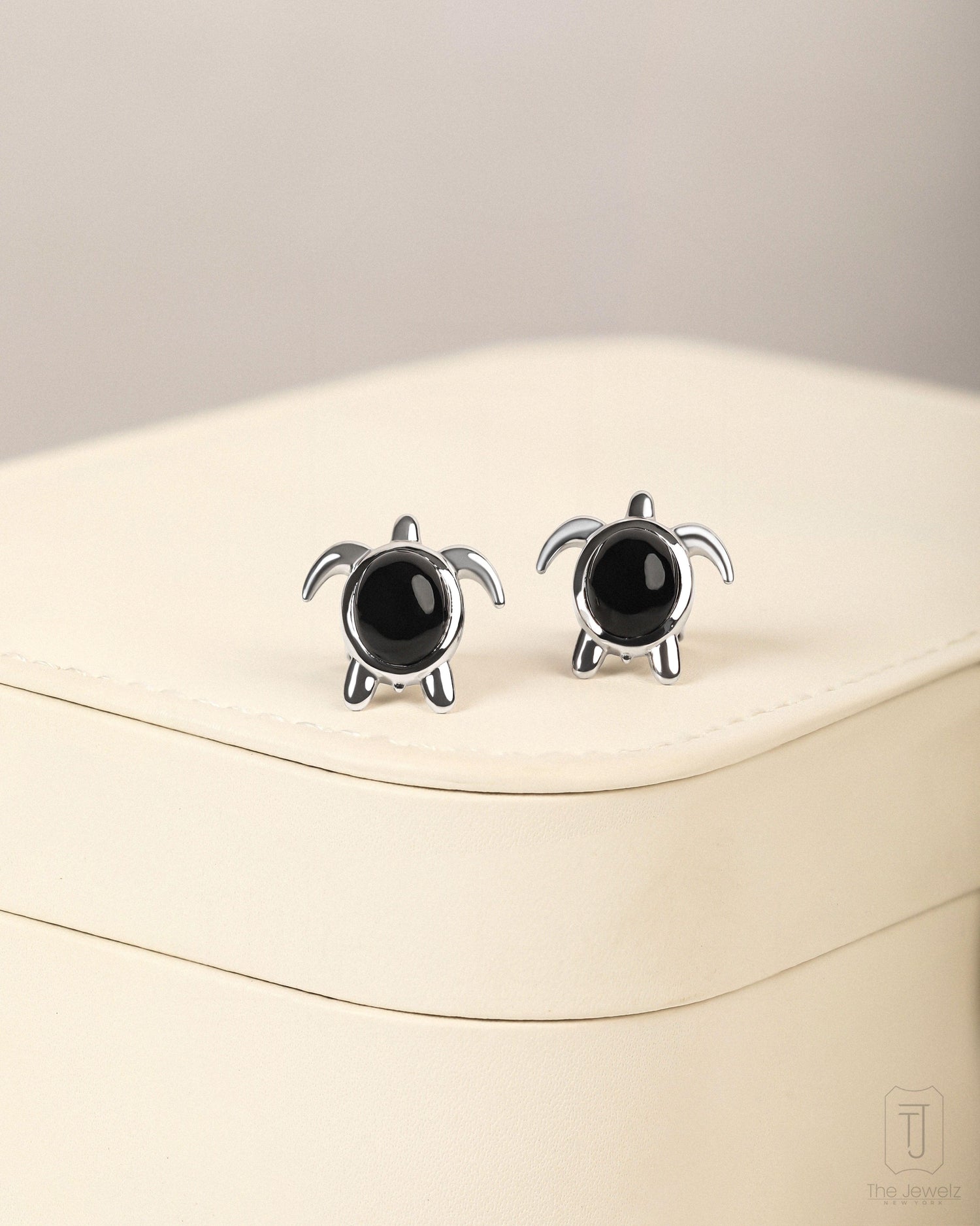 These Twilight Turtles' Silver Stud Earrings - Black Onyx by The Jewelz are a whimsical and elegant accessory. Crafted from genuine 925 silver, these lightweight studs feature bold 5.85-carat black onyx stones. Their playful pop of elegance is perfect for those who love a little sparkle with personality, making them a beautiful addition to any outfit.