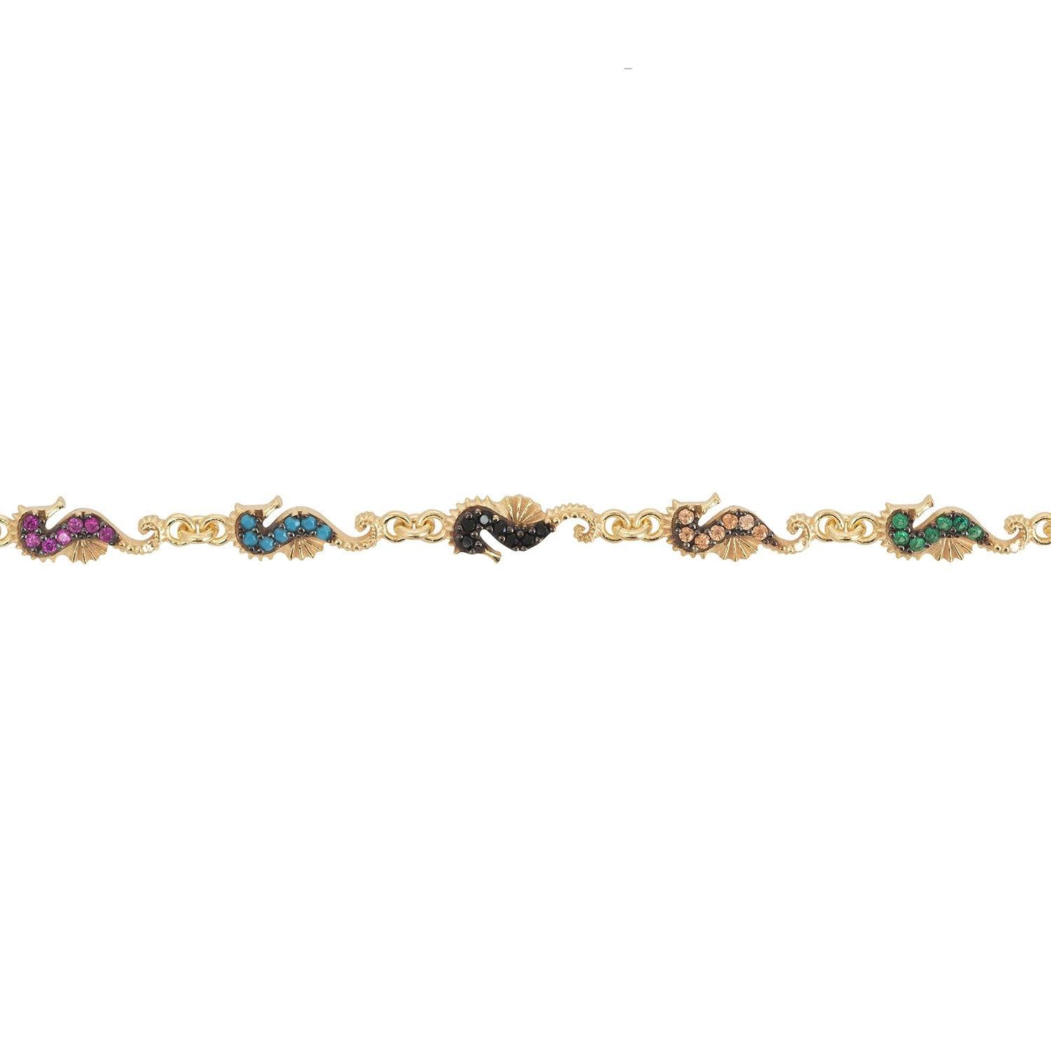 This bracelet is made of 925 sterling silver with 22ct gold plating. It features five small seahorses adorned with different colored cubic zirconia.
