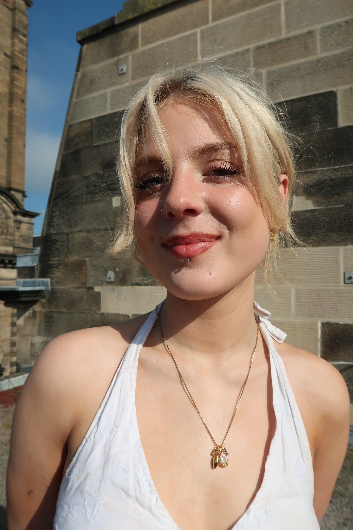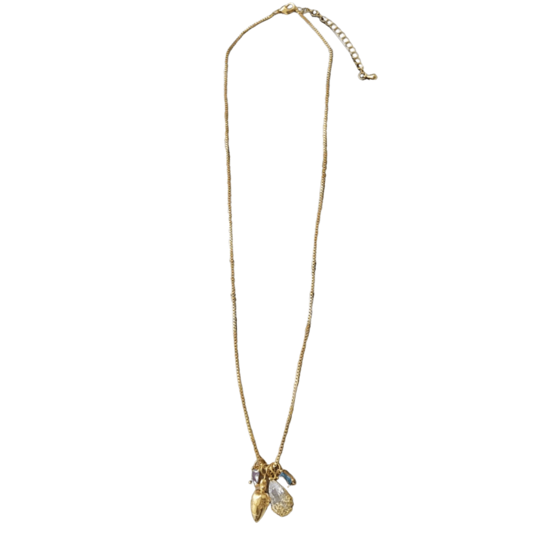 This necklace is crafted from 18k gold-plated stainless steel and is both waterproof and hypoallergenic. It features a collection of charms.