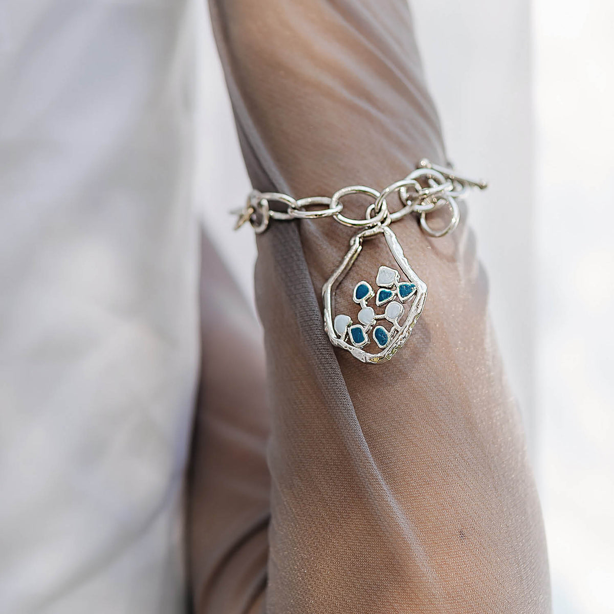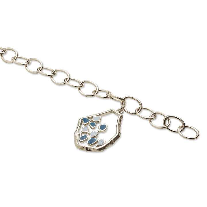 This bracelet is handcrafted from silver rhodium-plated brass. It features a heavily textured motif with blue enamel and has adjustable links with a toggle and clasp.