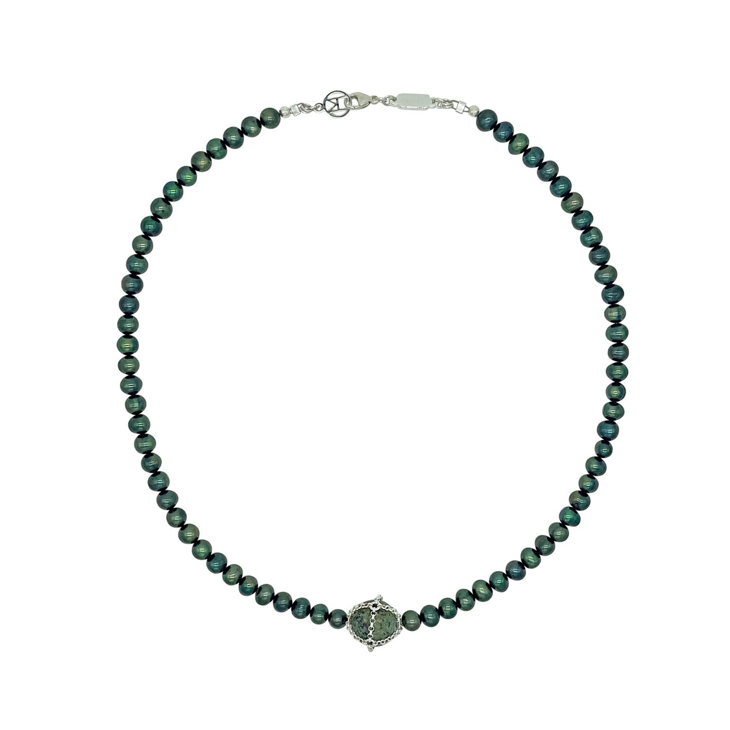 This choker features a turquoise stone encased in a sterling silver cage and a black pearl. It is finished with a signature Mhart closure.