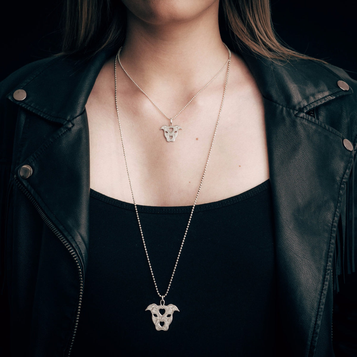 This Medium Silver Staffy Pendant Necklace from the Tattoo Candy collection by Cartergore is tailored to your individuality with its unique edge. This piece allows you to build your own personal story, making a statement that is as hard to define as you are. The staffy pendant is a tribute to the beloved dog breed, symbolizing loyalty and companionship, making it a meaningful accessory.