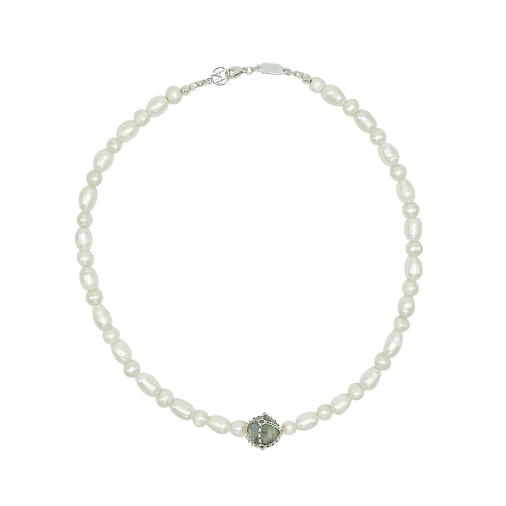This choker is handcrafted from .925 sterling silver and features a labradorite gemstone and freshwater pearls.