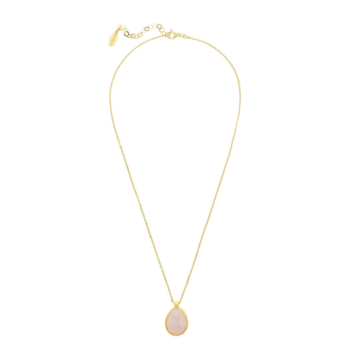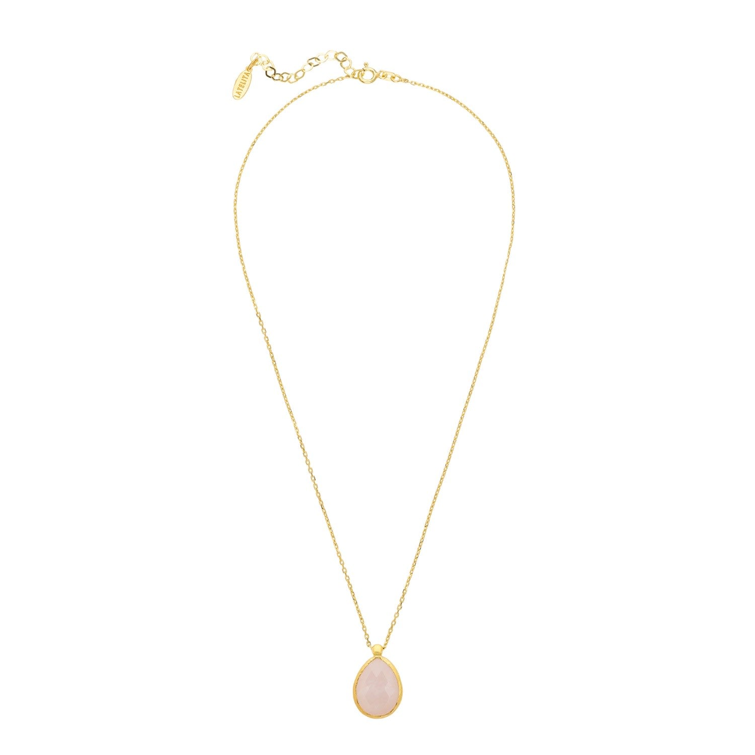 This Petite Drop Necklace by Latelita is ideal for those who love colorful jewelry. It features a medium-sized, teardrop-shaped rose quartz gemstone set in a metallic frame, creating a beautiful pop of color. The rose quartz is known as the stone of universal love and is believed to restore trust and harmony. This elegant necklace is perfect for adding a touch of color and meaning to any attire.