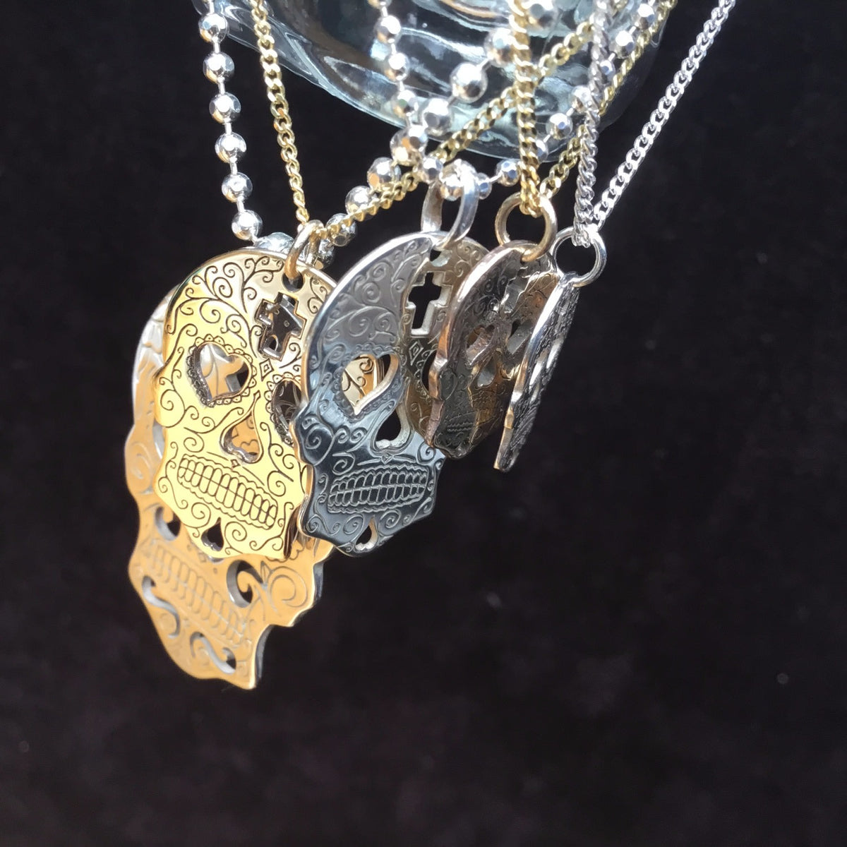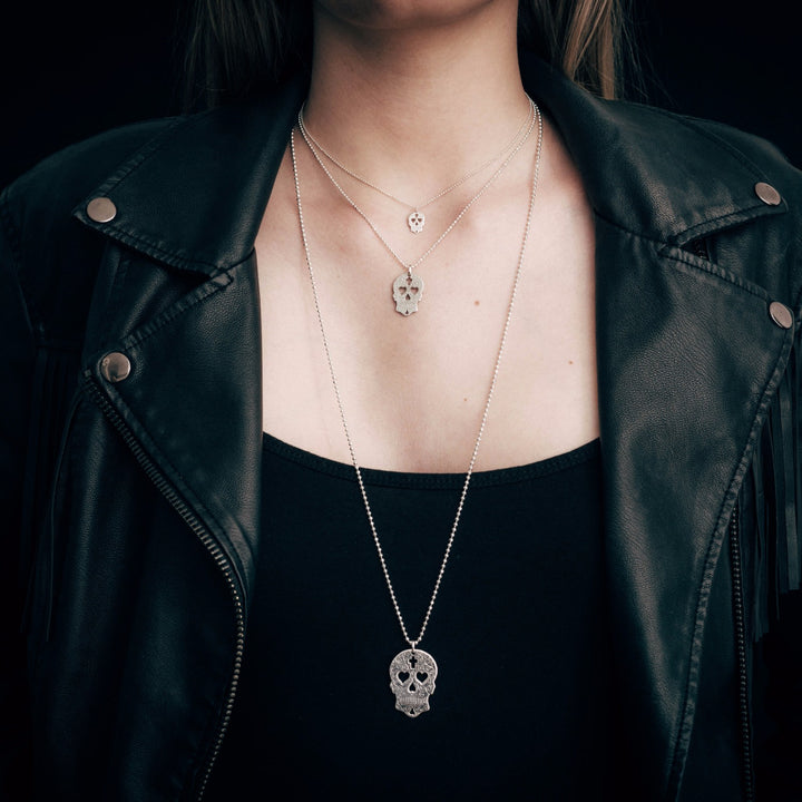 Medium Silver Sugar Skull With Heart Eyes Pendant Necklace