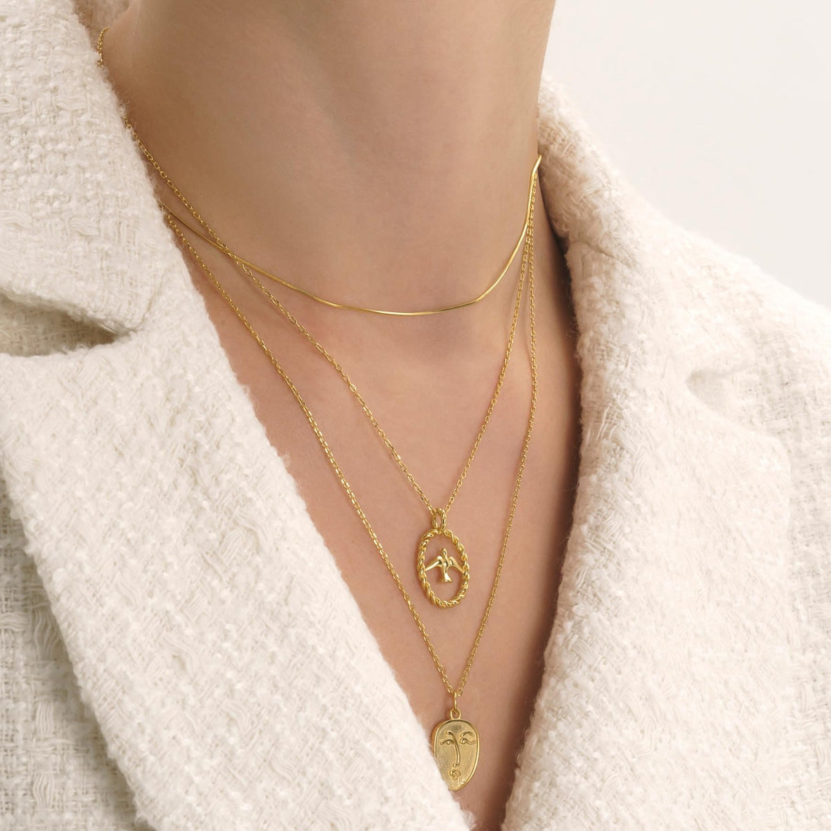 This necklace is made of solid sterling silver and is coated in genuine 14k gold plating. It has a snakeskin chain design and is 44cm long with an extender chain.
