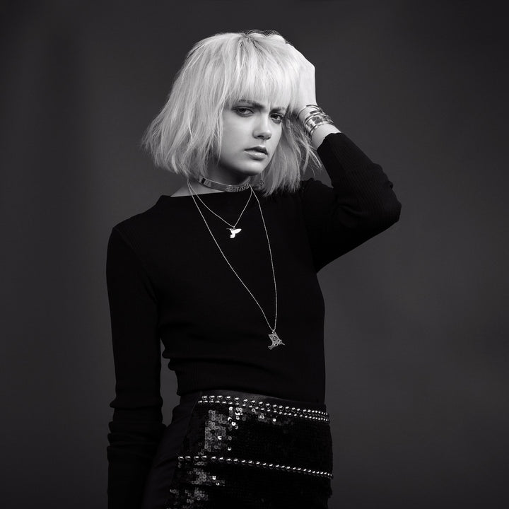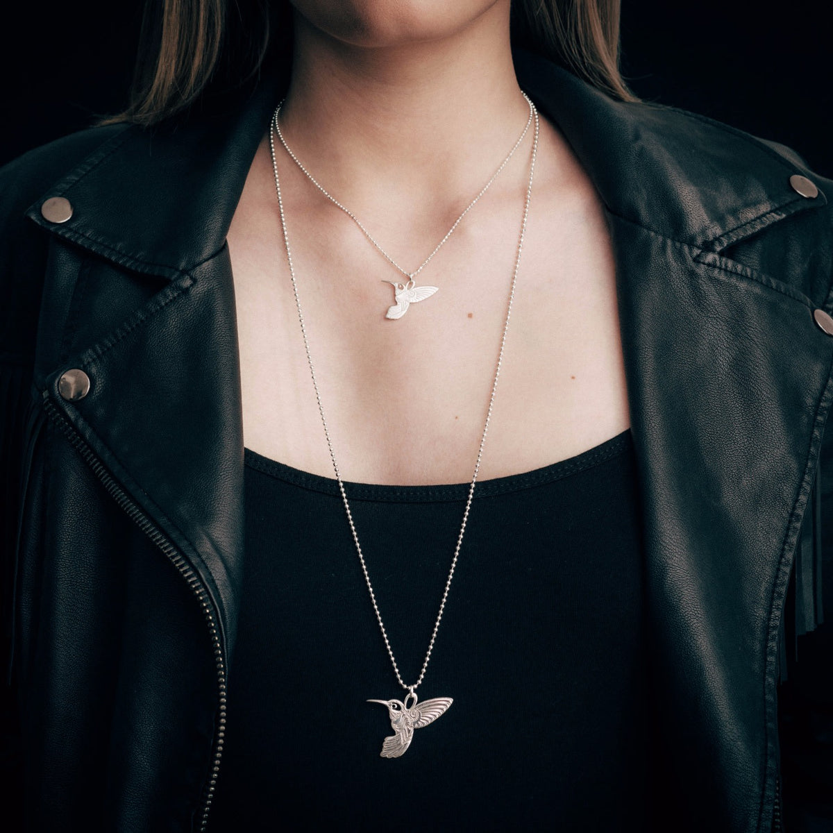 This Medium Silver Humming Bird Pendant Necklace from the Tattoo Candy collection by Cartergore is a bespoke accessory tailored to your individuality. Its traditional tattoo styling gives it a unique and edgy flair. This necklace is perfect for mixing and matching with other pendants and charms from the collection, allowing you to build your own personal story and express yourself.