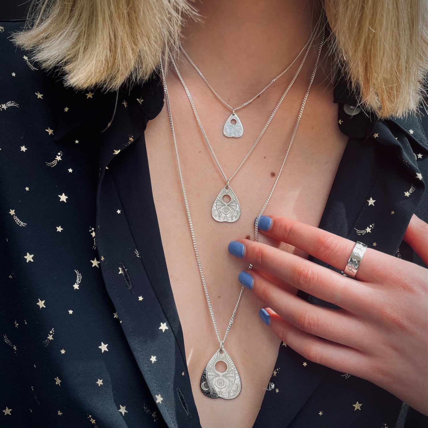 This Medium Sterling Silver Angel Wings Planchette by Cartergore is a unique and spiritual accessory from the Tattoo Candy collection. This piece features a sterling silver angel wings motif on a planchette design, a powerful symbol of protection and guidance. This pendant has a bespoke beauty and a unique edge inspired by traditional tattoo styling. It’s perfect for layering to build your own story or wearing alone as a personal amulet that encapsulates a premium and unique feel.