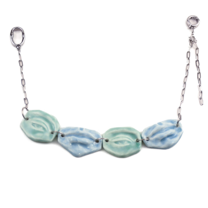 This My Body Eye With Lip Choker Necklace Glossy Green And Blue by H2 Studio is a unique and bold piece from the My Body Series, a collection celebrating the sacredness of the human body. This choker is designed to be wearable art, mirroring the contours and textures of human anatomy. It serves as a powerful reminder of our body’s beauty and strength, encouraging self-love and body positivity. The glossy green and blue tones make this piece a distinct and artistic statement, perfect for someone who wishes to express their unique physical essence.