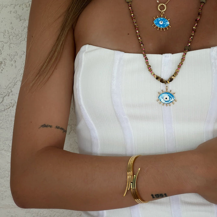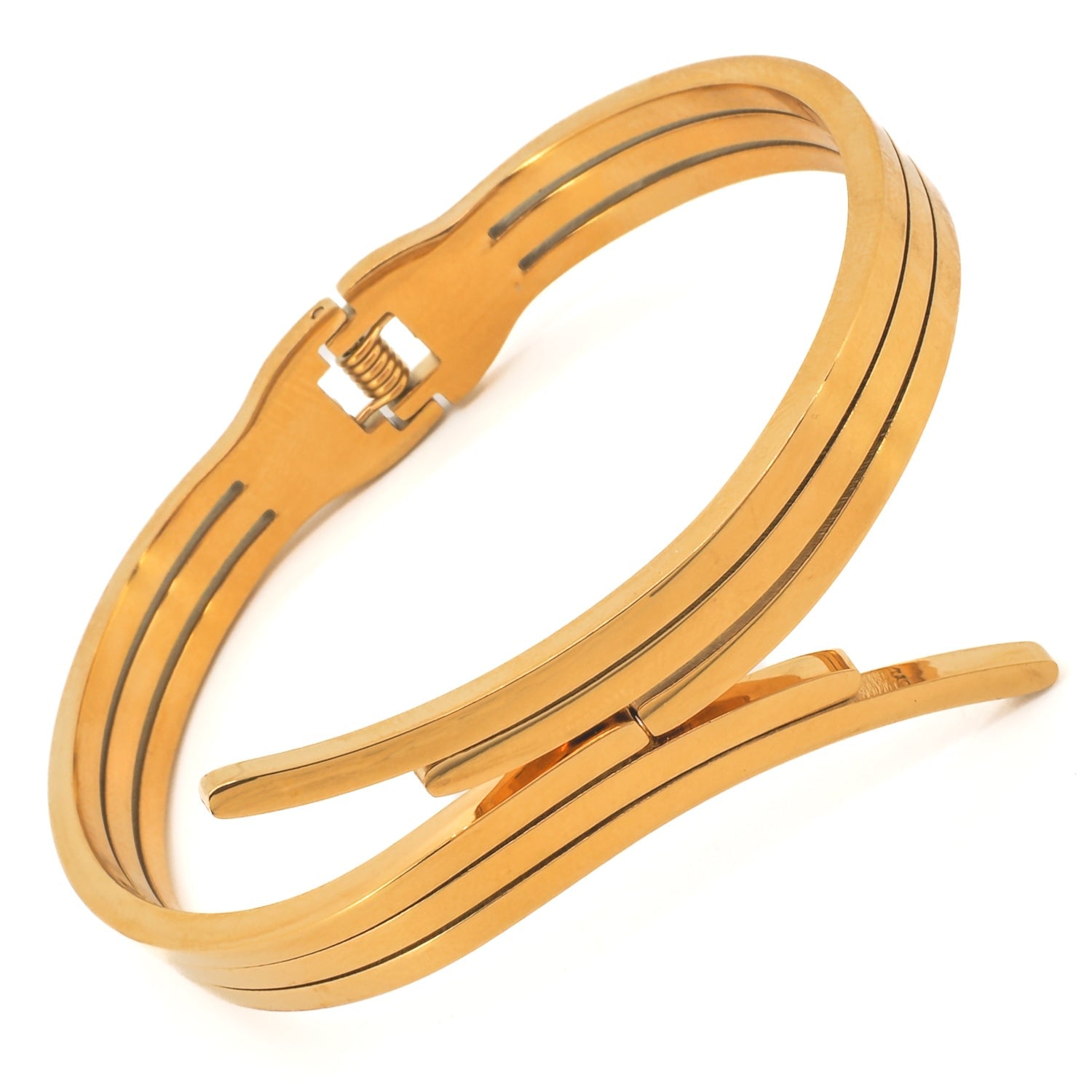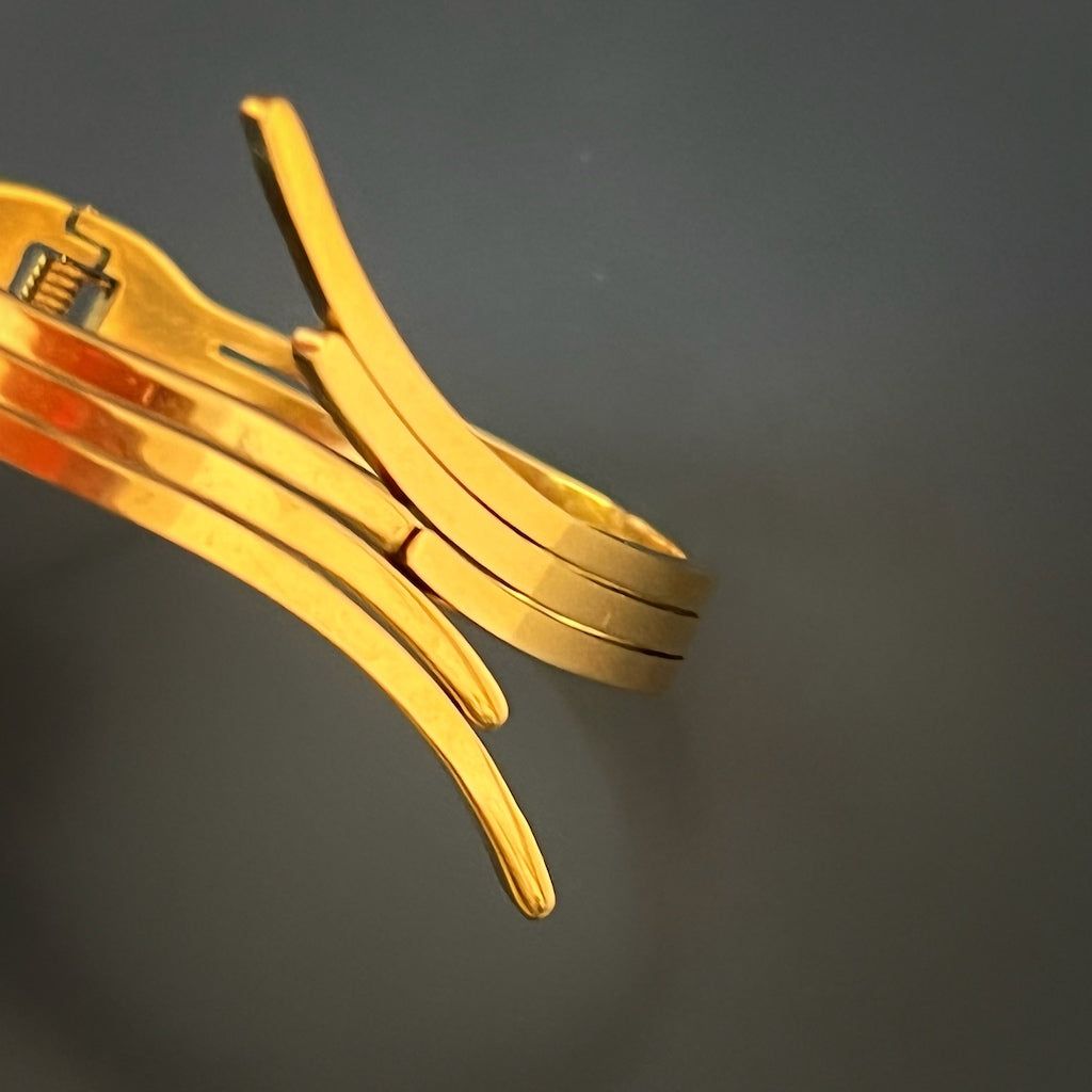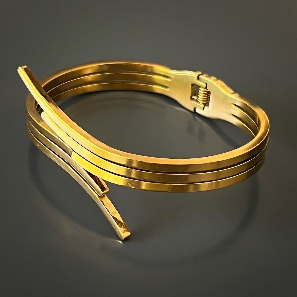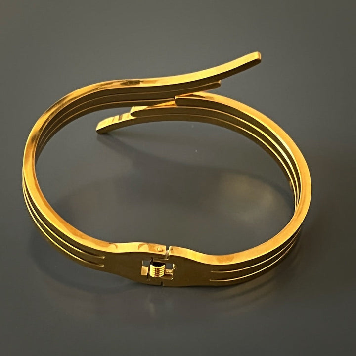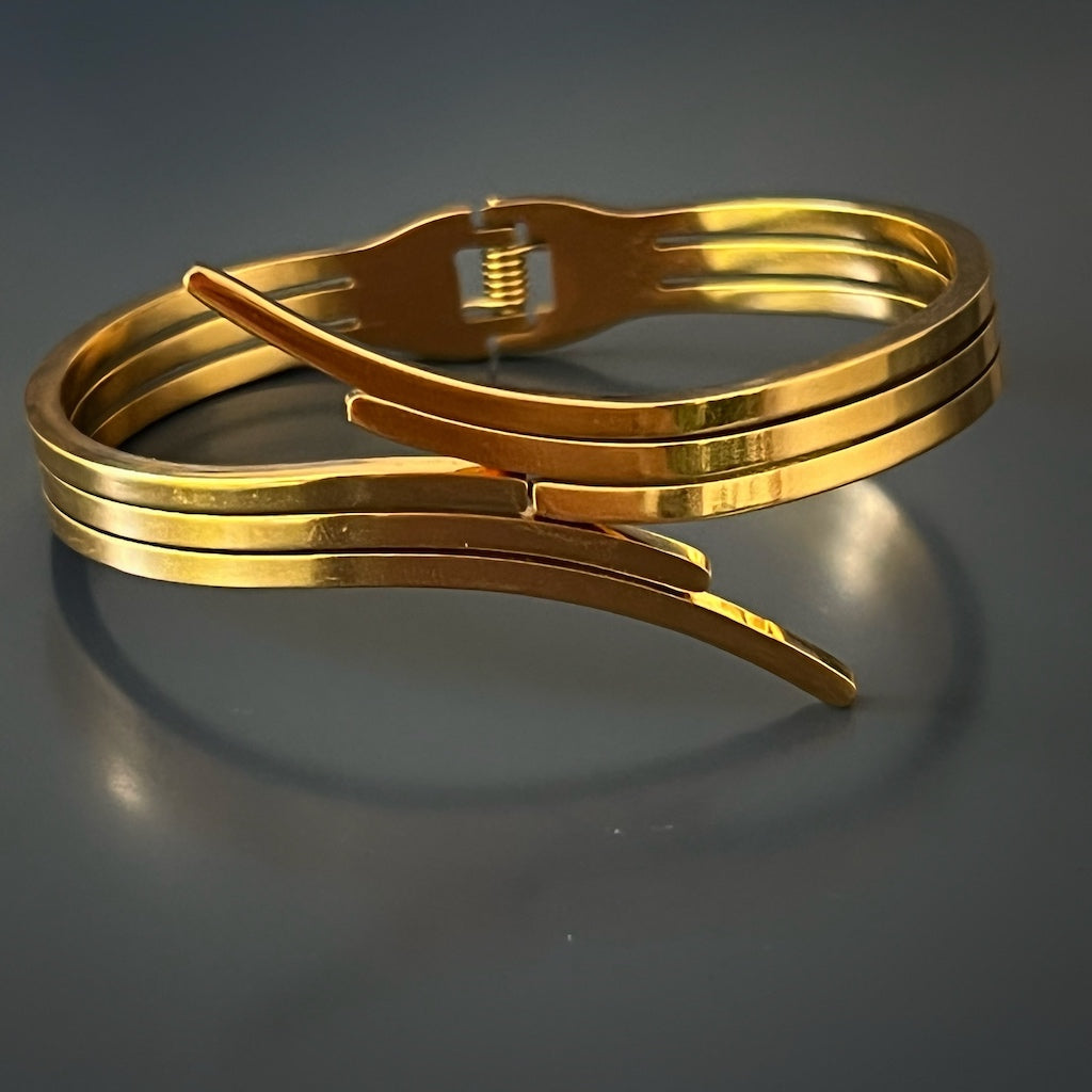 This adjustable bangle bracelet is made of high-quality 18K gold-plated steel.