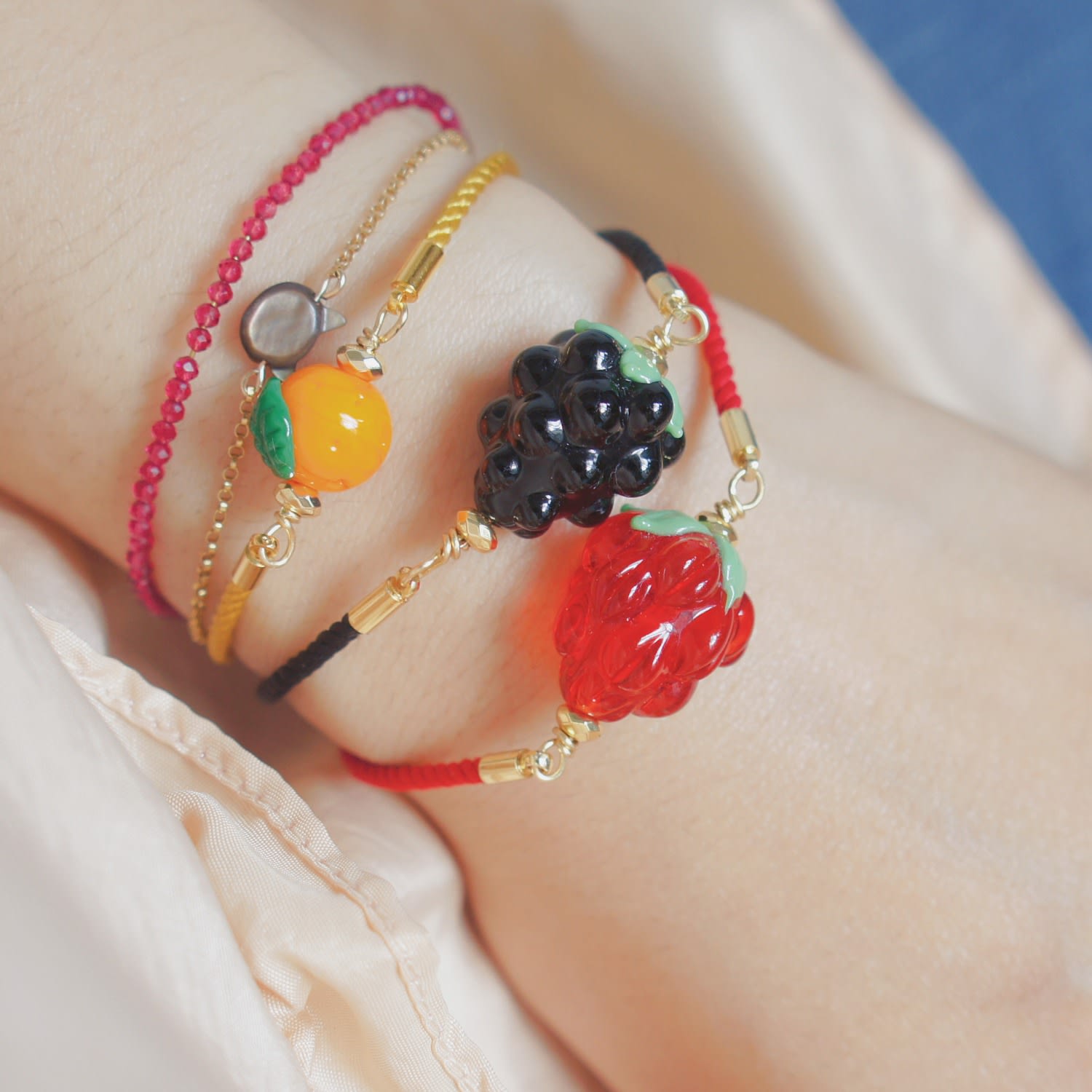 This handcrafted bracelet is made with lampwork glass, silk, polyester, and gold-plated brass.