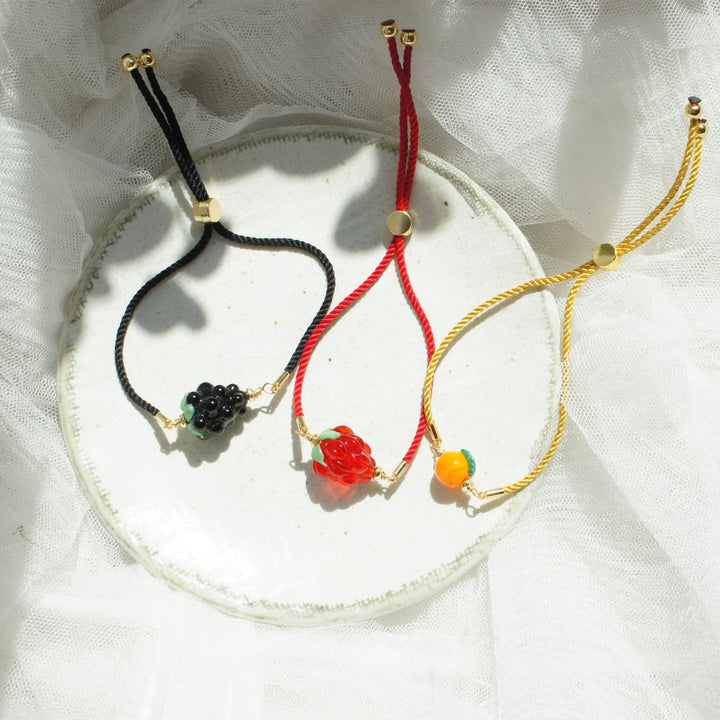 This Very Berry Lampwork Glass Blackberry Cord Bracelet With Slider by I'mmany London is a lovely and unique accessory. Each piece features a handmade lampwork glass blackberry on a twisted cord with a comfortable golden slider. This bracelet is a fun and playful conversation starter, perfect for adding a touch of whimsy to your style.