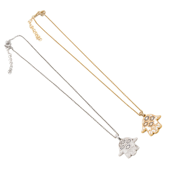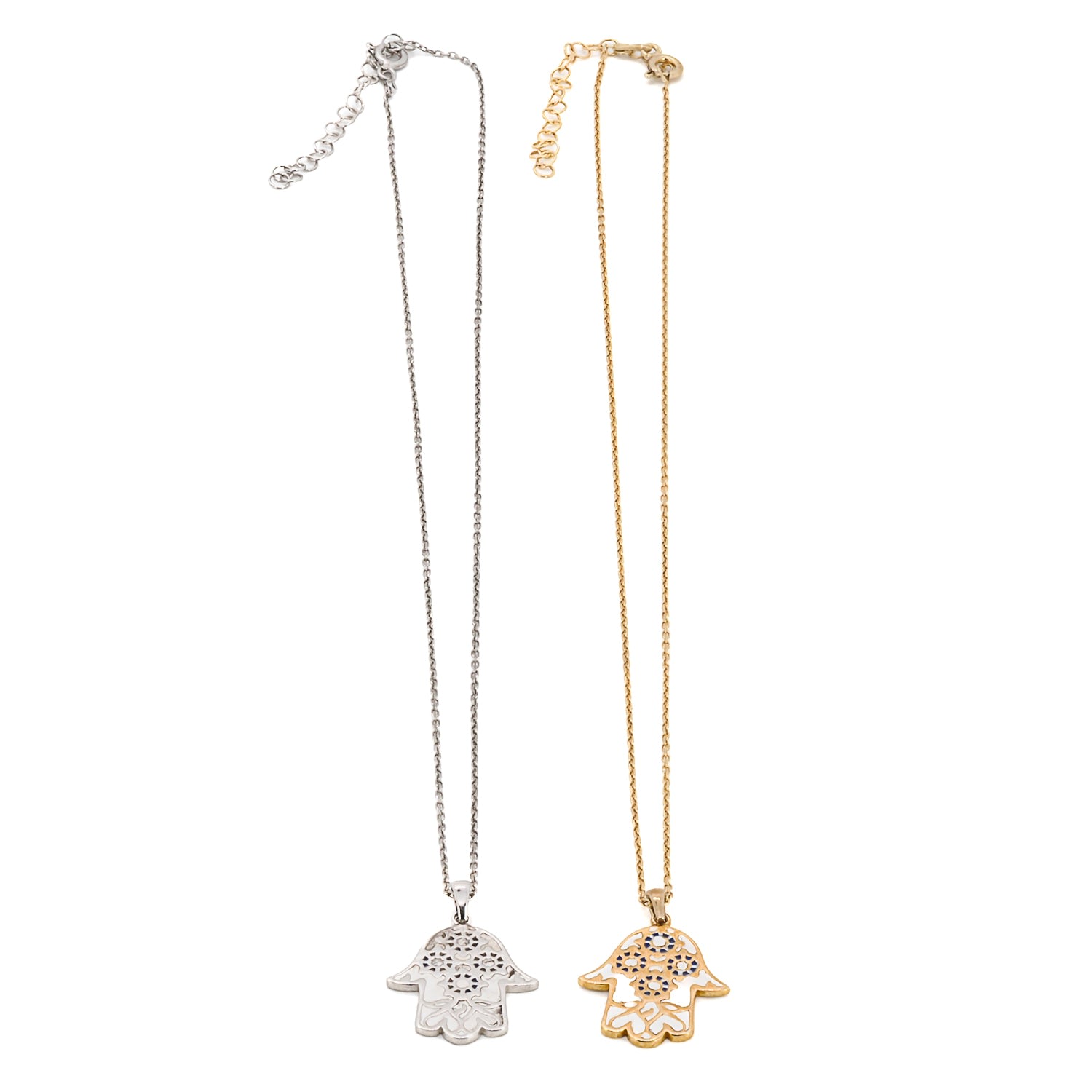 This necklace is made of 925 Sterling Silver with a white enamel pendant. The second option is 18K gold plated on sterling silver with a white enamel pendant. The necklace length is 16 inches with a 2-inch extender.