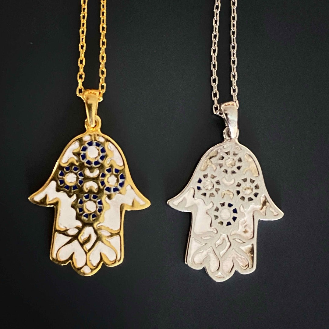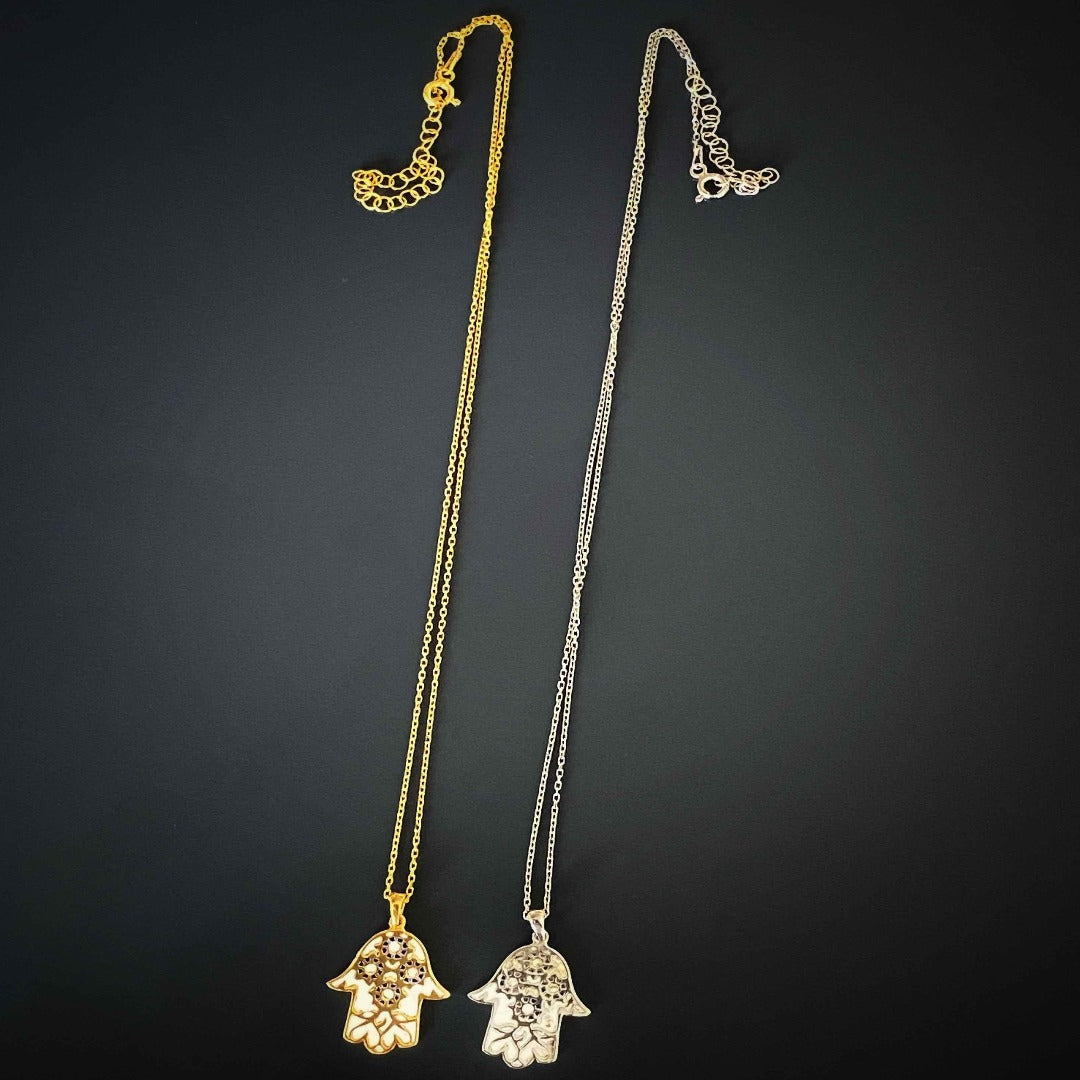 The Pure Love Hamsa Necklace by Ebru Jewelry holds powerful spiritual significance. The phrase "Pure Love" reminds us to focus on love and positivity, while the Hamsa symbolizes protection and good fortune. This stunning piece is available in two options: a sterling silver chain with a white enamel Hamsa pendant or an 18K gold plated chain on sterling silver with a white enamel Hamsa pendant. The necklace is a beautiful reminder of positivity and protection.