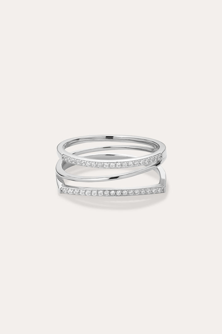 This Nola Pavé Triple Band Ring In Silver by Vanchi is a beautiful and effortless accessory that gives the look of a perfectly stacked trio in one elegant design. It features a sleek square band, a sparkly pavé band, and a delicate criss-cross band, offering a perfect balance of textures. This ring is your go-to for easy elegance without the hassle of stacking multiple rings.