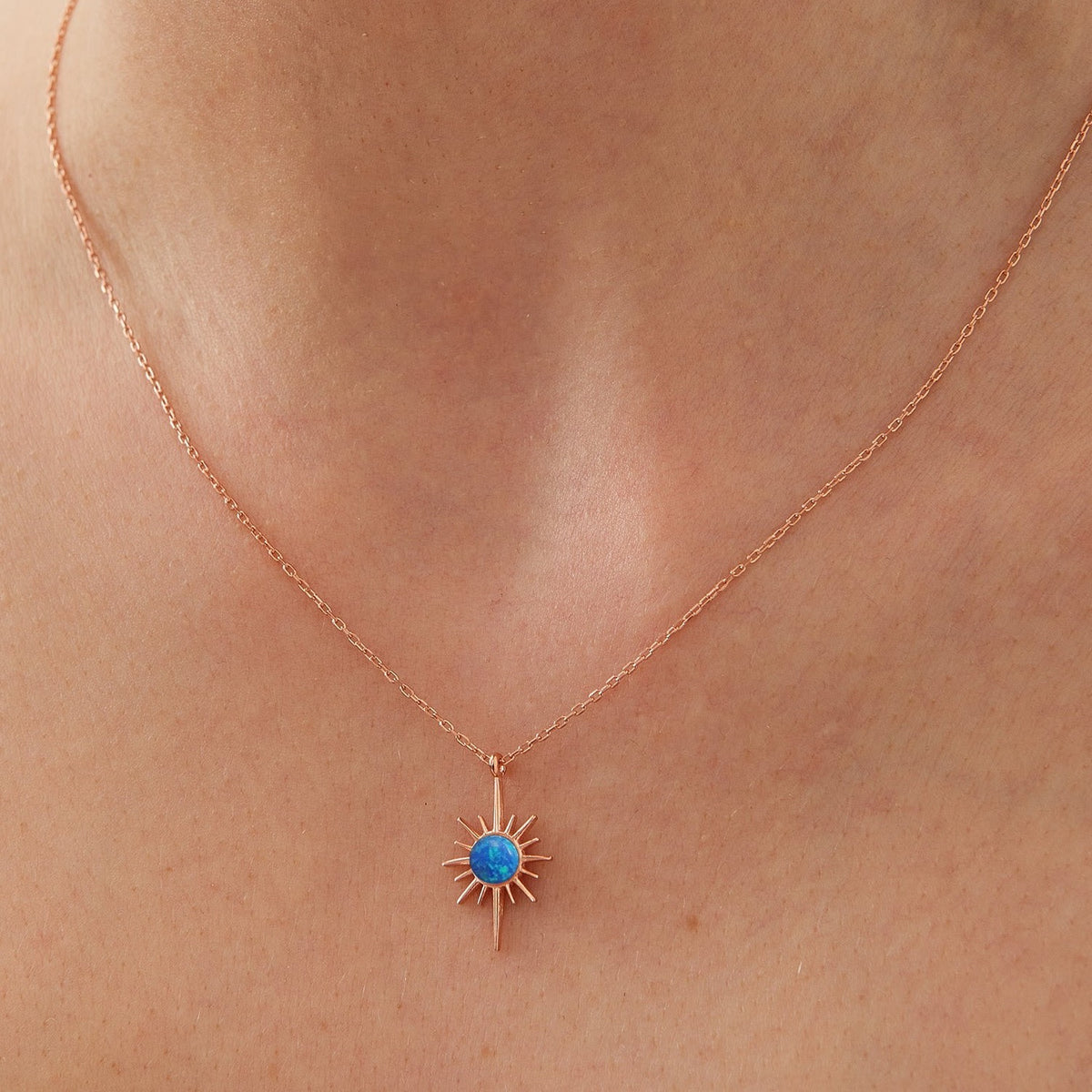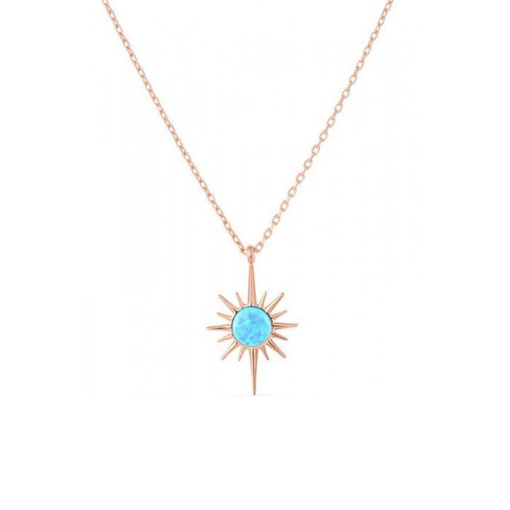 Crafted from sterling silver with a rose gold finish, this necklace features a blue opal Northernstar pendant.