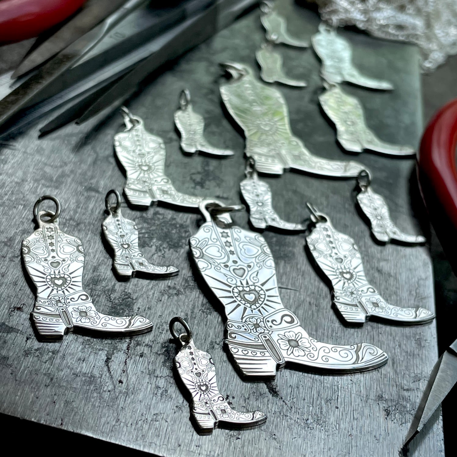 Handmade in sterling silver. Engraved cowboy boot motif, medium size.