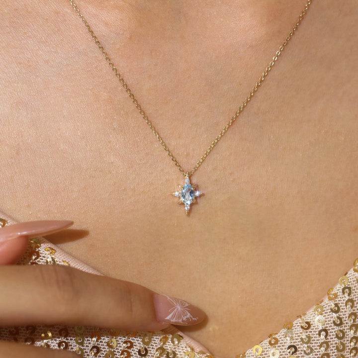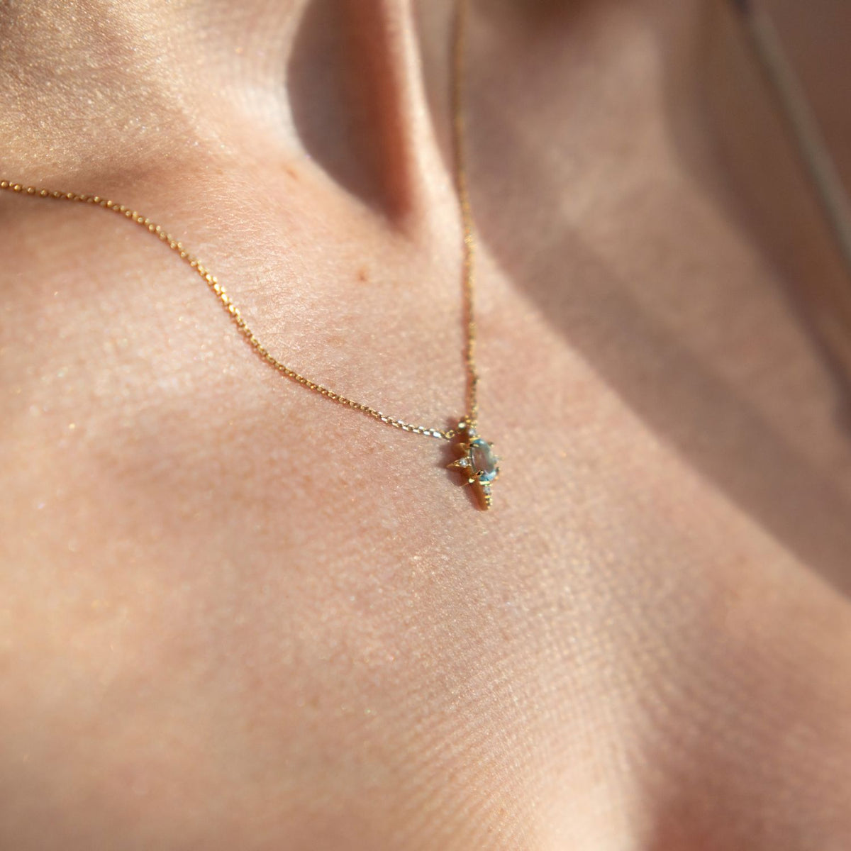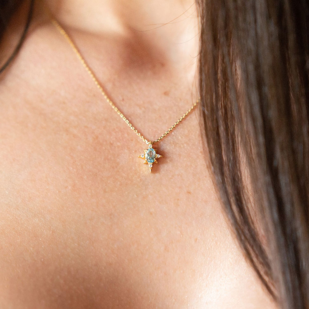 This Ocean Star Sky Blue Topaz Yellow Gold Vermeil Necklace by Azura Jewelry New York channels the luminous mystery of the sea. Inspired by the starfish, it features radiant topaz gemstones set in a spiked design that sparkles with celestial beauty. A perfect piece for gifting, it symbolizes guidance, protection, and the brilliance of the ocean.
