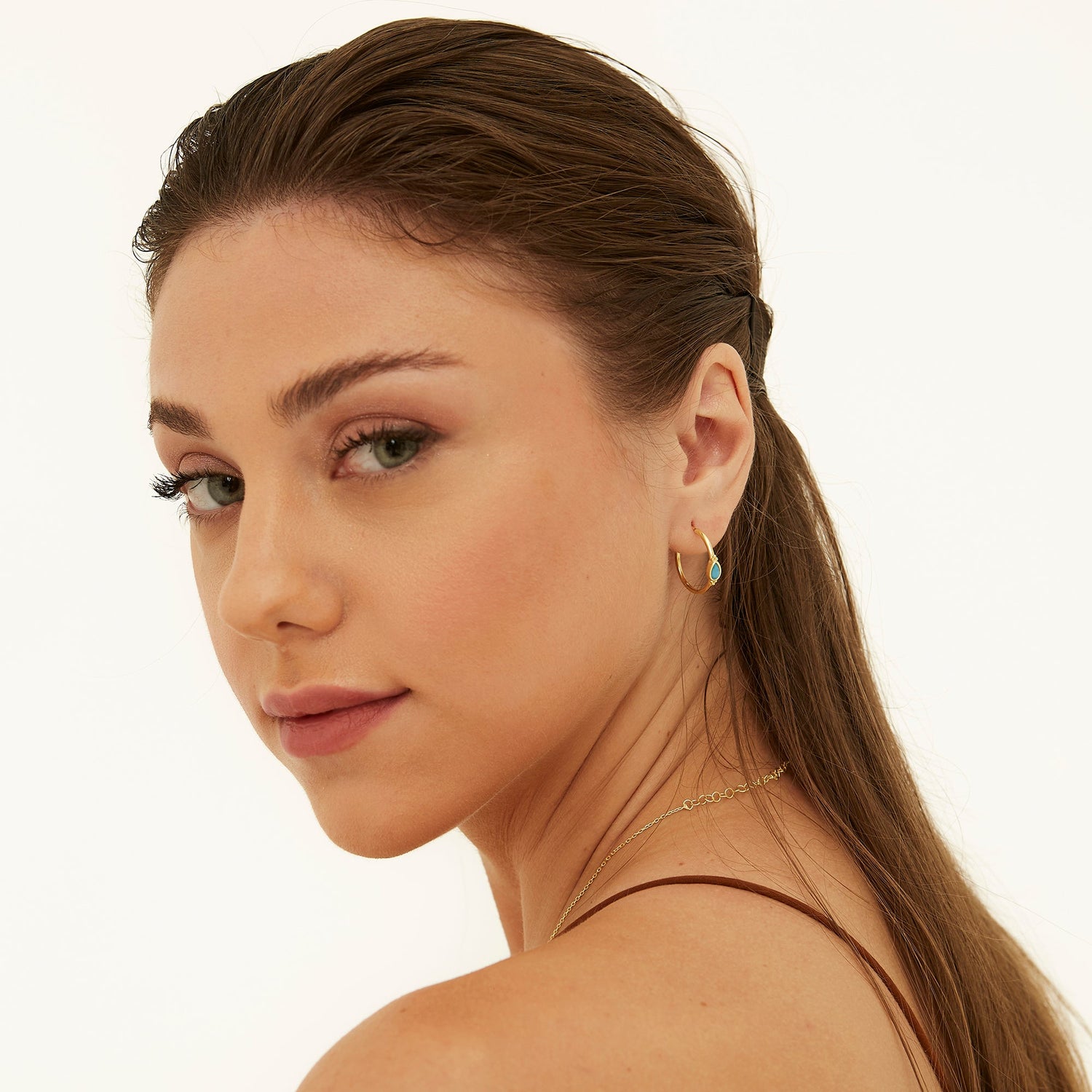 These Drop Gold Solitaire Earrings by Spero London are a sophisticated accessory designed to bring a charming impact to your everyday style. They feature a chic hoop with a stunning drop-cut turquoise crystal at the center, creating an everlasting shine. The butterfly-post closure ensures a secure and comfortable fit, while the elegant design allows for versatile styling. Wear them alone for a refined look or stack them with other pieces for a fashion-forward ensemble, embracing a sense of modern chic.